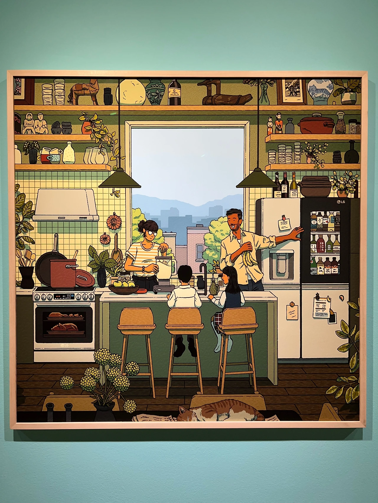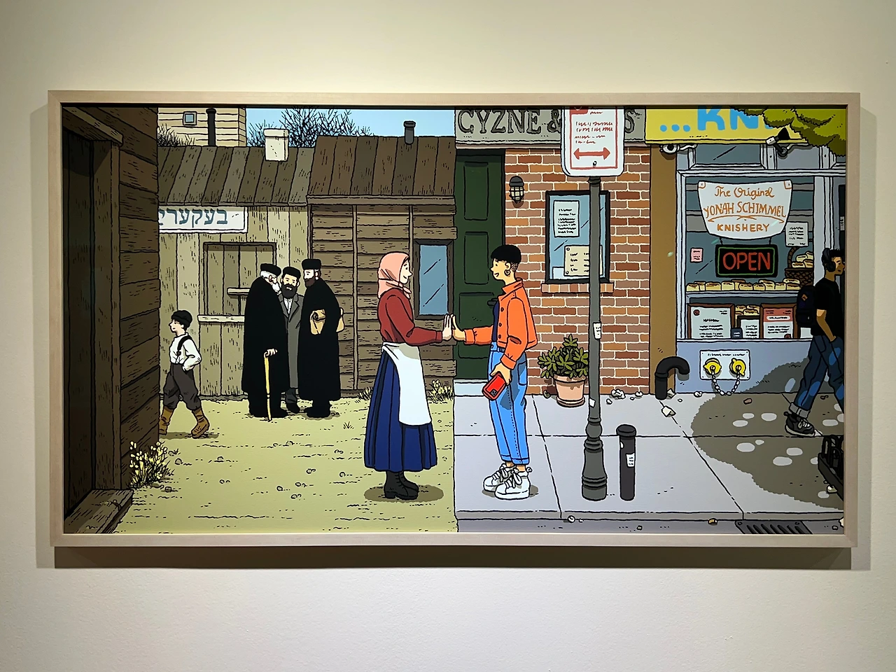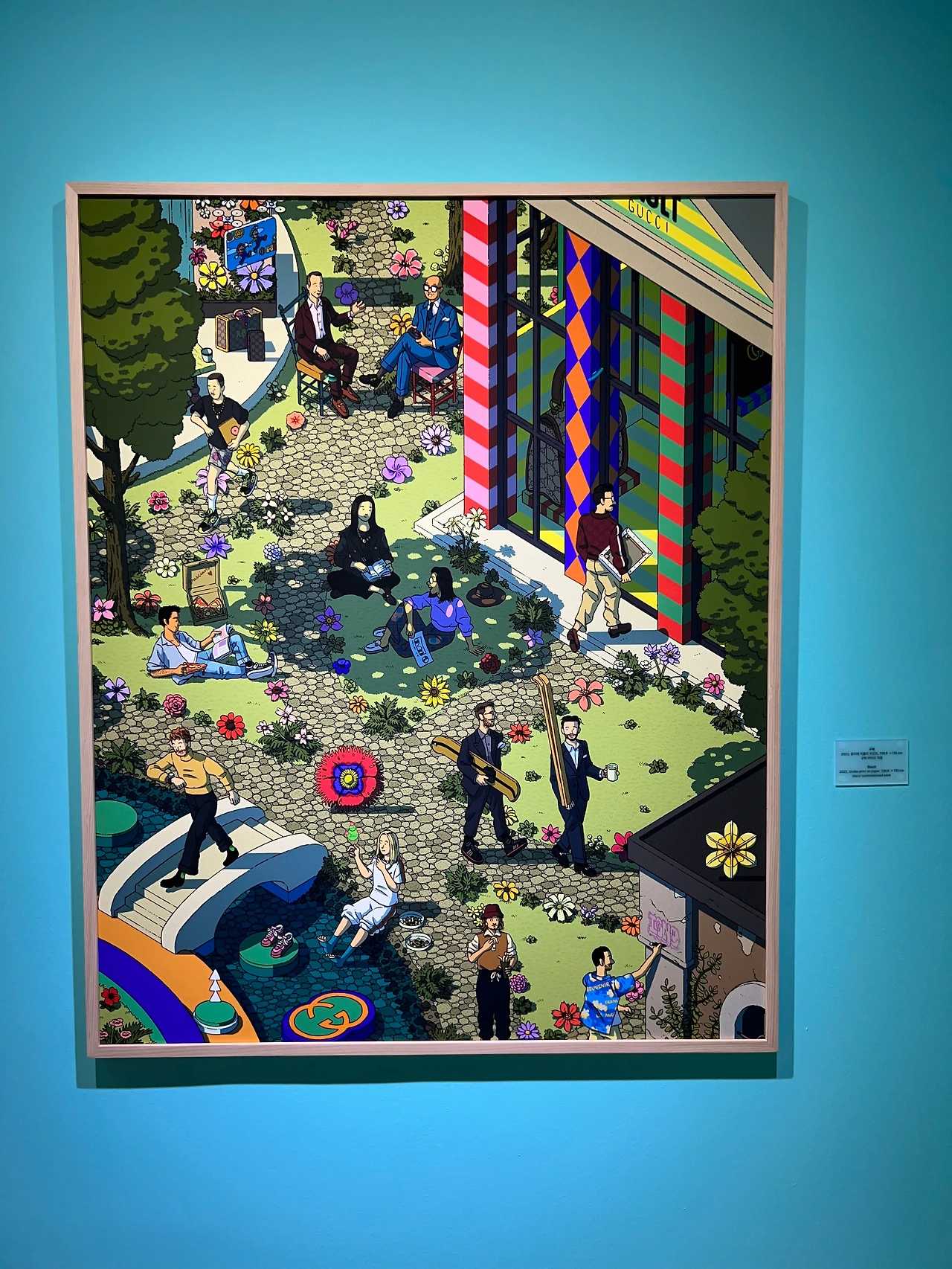 우선 가장 왼쪽 하단에 있는 그림은 <봄의 장면>(2023) 연작 중 첫 번째 <푸른 초원을 찾아서>입니다. <봄의 장면>은 의류 브랜드 '페인터 재킷' 커미션 작품으로 총 3점으로 구성되었는데, 그림 속 붉은 체크무늬 옷이 꽤 인상적이죠. 상단 중간 그림 <다리>(2021)는 외국어 학습 애플리케이션 '듀오링고'의 커미션 작품입니다. "작품 한가운데 수직선을 중심으로 왼편에는 슈트레이멜을 쓴 유대인들이 이디시어 간판이 있는 거리에 모여있는 과거의 모습을, 이와 반대로 오른편에는 유대 요리 크니쉬를 판매하는 빵집이 있는 현재 뉴욕 맨해튼의 모습을 병치"하고 있는데, 2021년에 듀오링고에 이디시어가 추가된 것을 기념해, 듀오링고가 이들을 상호 소통을 가능하게 하는 다리의 역할을 한다는 의미를 담고 있죠. 그 아래엔 LG 전자 커미션 작품으로, <새로운 하루를 위한 시작>(2022)입니다. 이 작품 외에도 LG전자 커미션 작품이 있지만, 이 작품이 특히 더 한국적인 요소들이 많이 보이더라고요. 메시지도 분명했지만, 그에 앞서 LG 냉장고 안에 복분자주, 소주, 박카스와 청자, 목안 등 우리 것이 많이 보여 좋았습니다. 그 옆엔 <구찌>(2022)와 양주 브랜드 <봄베이 사파이어>(2019)의 커미션 작품이고요. 브랜드가 우악스럽게 드러나지 않으면서 이미지 메이킹이 제대로 되니 협업 의뢰가 끊이지 않나 봐요.