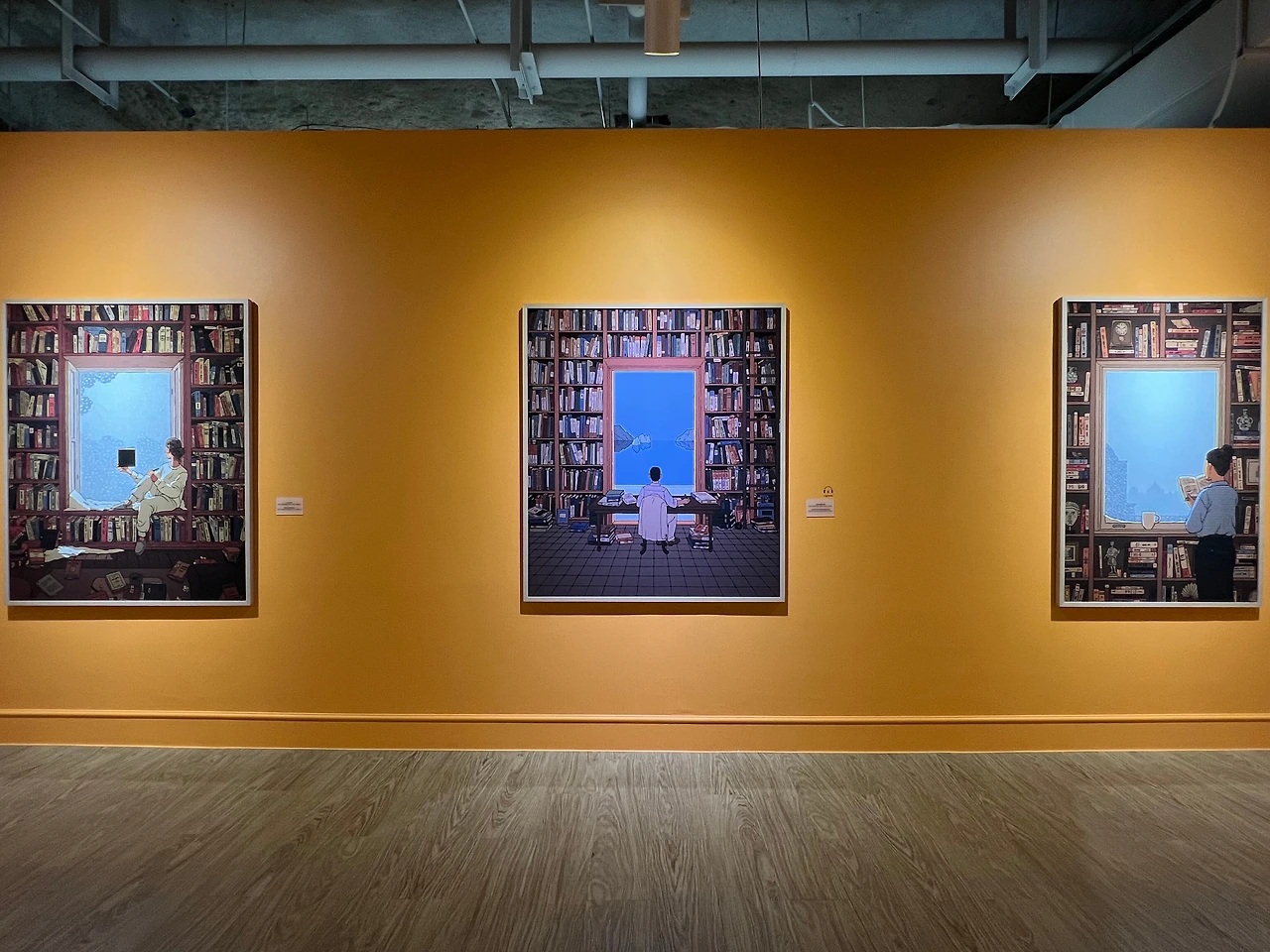 1부에서 제가 가장 집중했던 작품은, <A LIBRARY BY THE TYRRHENIAN SEA>(2018)입니다. 제게 일리야 밀스타인이라는 작가를 각인시킨 작품으로, 전시장 가장 중앙에 설치되어 있어요. 양옆으론 서재를 배경으로 한 다른 작품들도 있는데, 화면 속 인물이 서가 가운데 뚫린 창을 통해 창밖의 풍경에 매료된 것처럼, 전시장에서도 이 창을 통해 '그곳에 함께'하는 듯한 착각을 불러일으키며 관람객을 동화시킵니다. 타인의 서재를 구경하는 재미도 선사하는 이 그림들은 '나도 저런 서재를 갖고 싶다'란 부러움을 자아내기에 충분하고요. 책으로 빼곡한 서재 한가운데서 지중해의 푸른 티레니아 바다를 응시하는 사람은 작가 자신이라는데, 양 옆의 여성은 연인이지 않을까 싶네요. 이 섹션 자체가 작가의 자아가 두드러지는 작품과 연인을 묘사한 작품을 주로 선보이니까요.