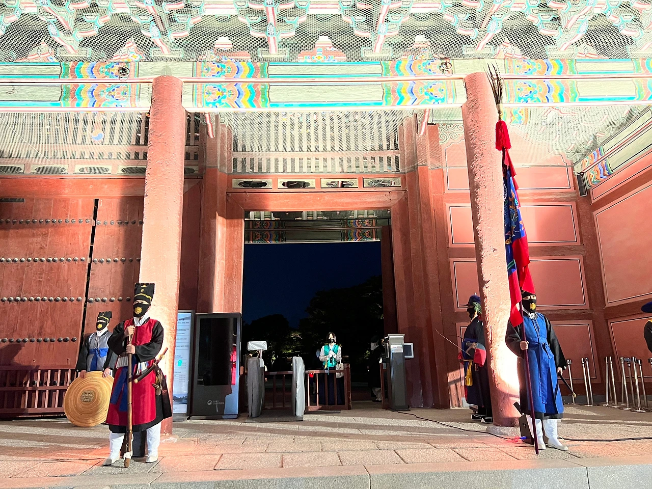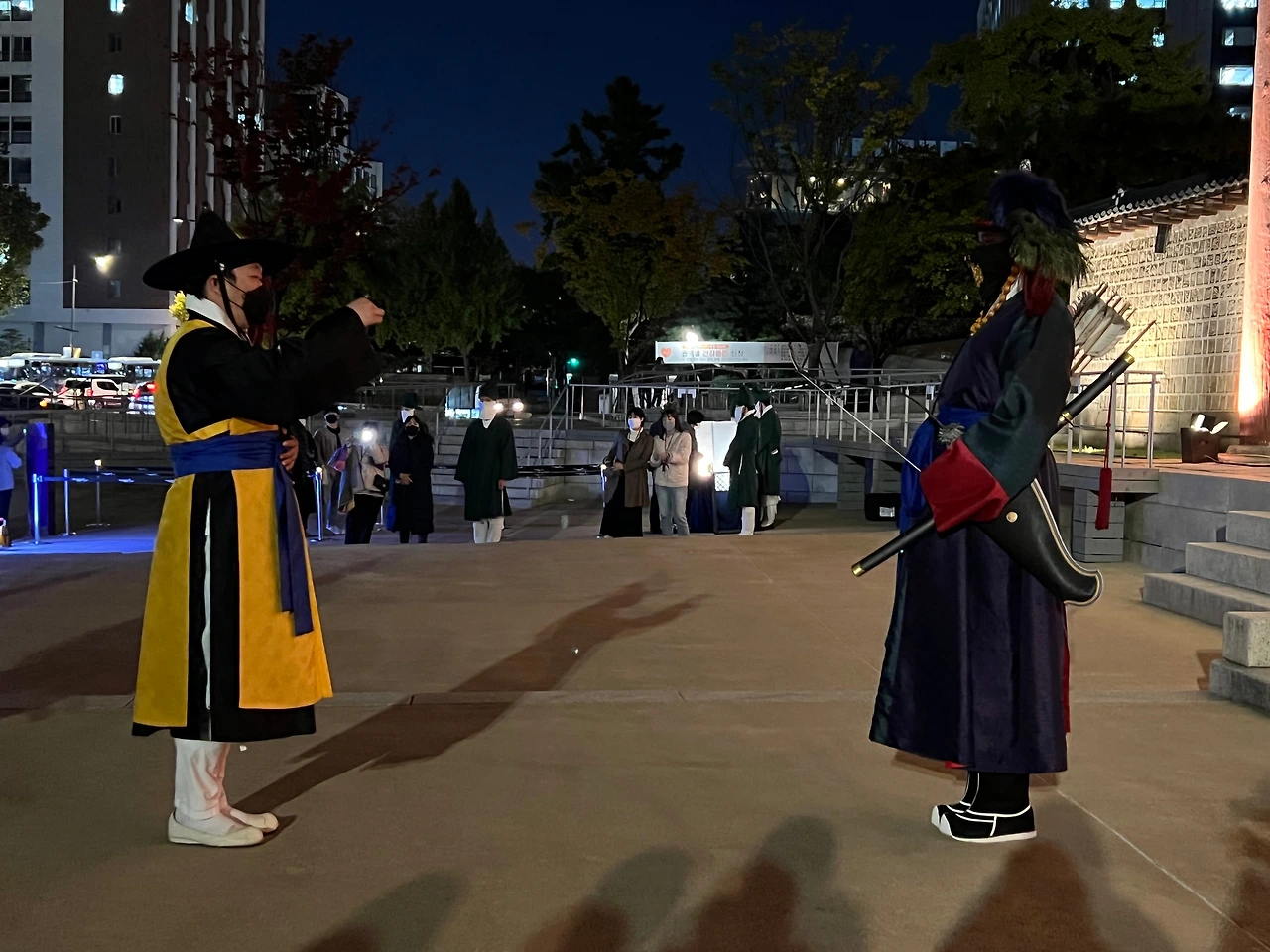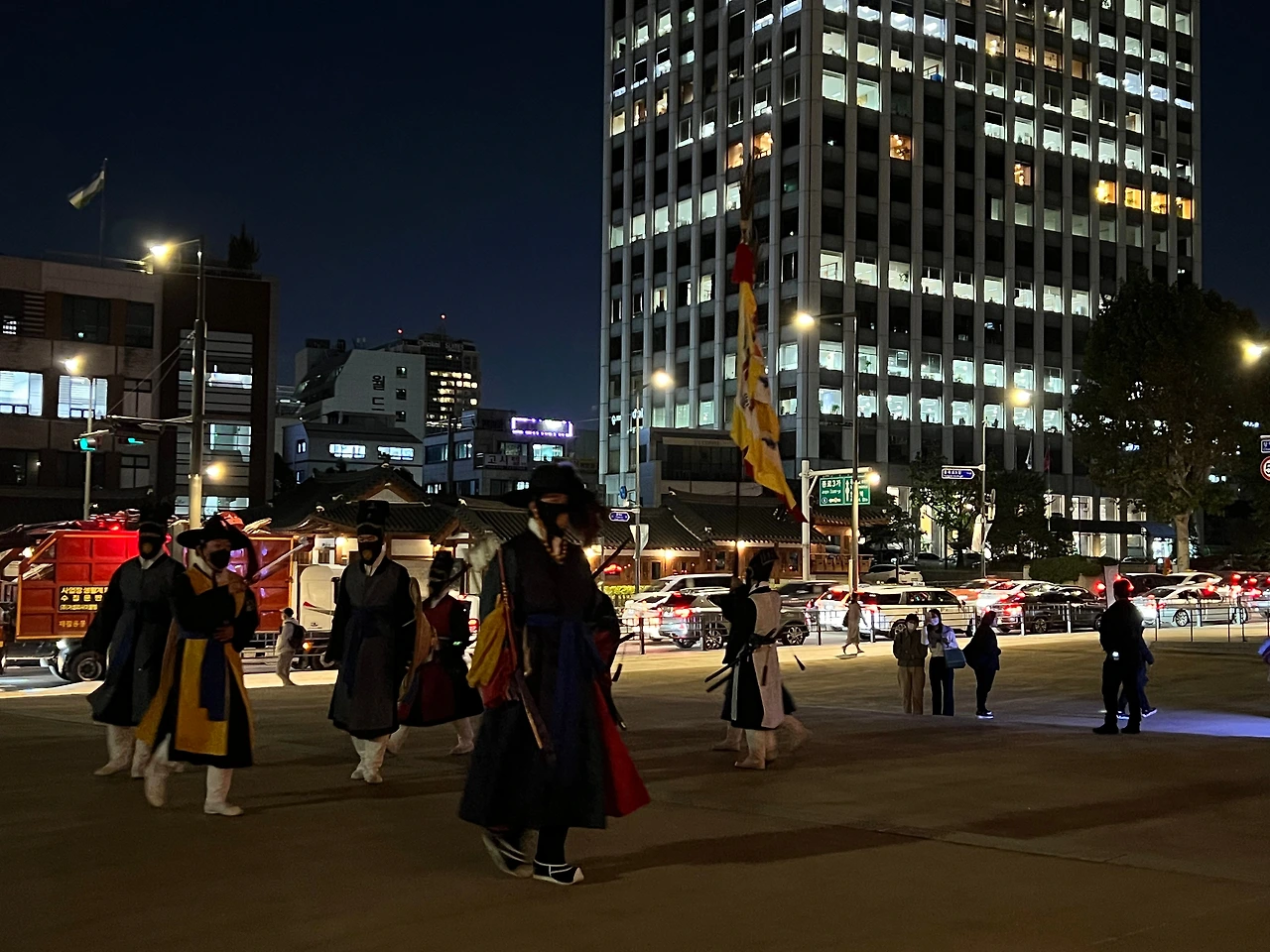 <달빛기행>은 창덕궁의 정문인 돈화문 부근에서 입장 15분 전부터 본인 확인을 진행합니다. 확인을 마치면 돈화문 앞으로 자리를 옮겨 대열에 서서 돈화문이 열리길 기다리죠. 기다리는 동안 나각수의 신호로 수문장들의 행렬이 짧게 진행되고, 정시에 문이 열리면서 담당 해설사가 나타나면 본격적으로 프로그램이 시작됩니다.