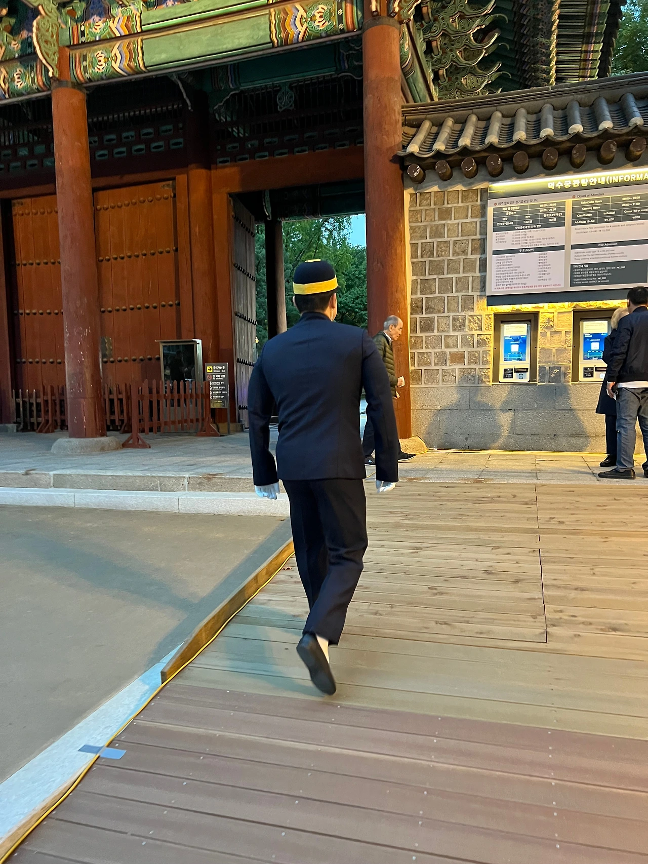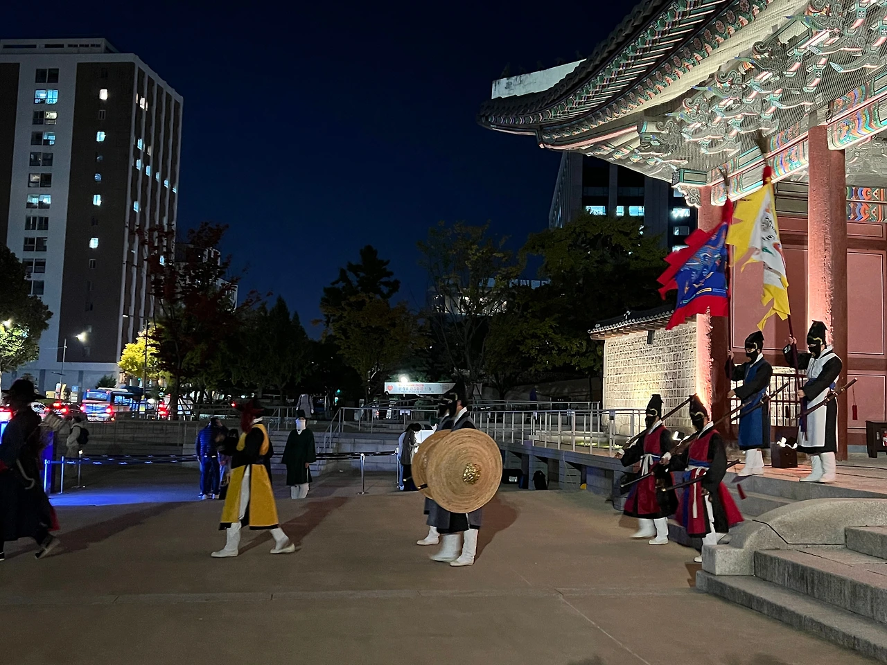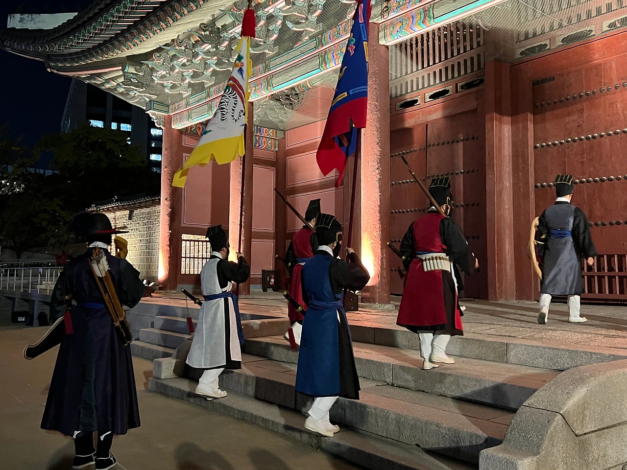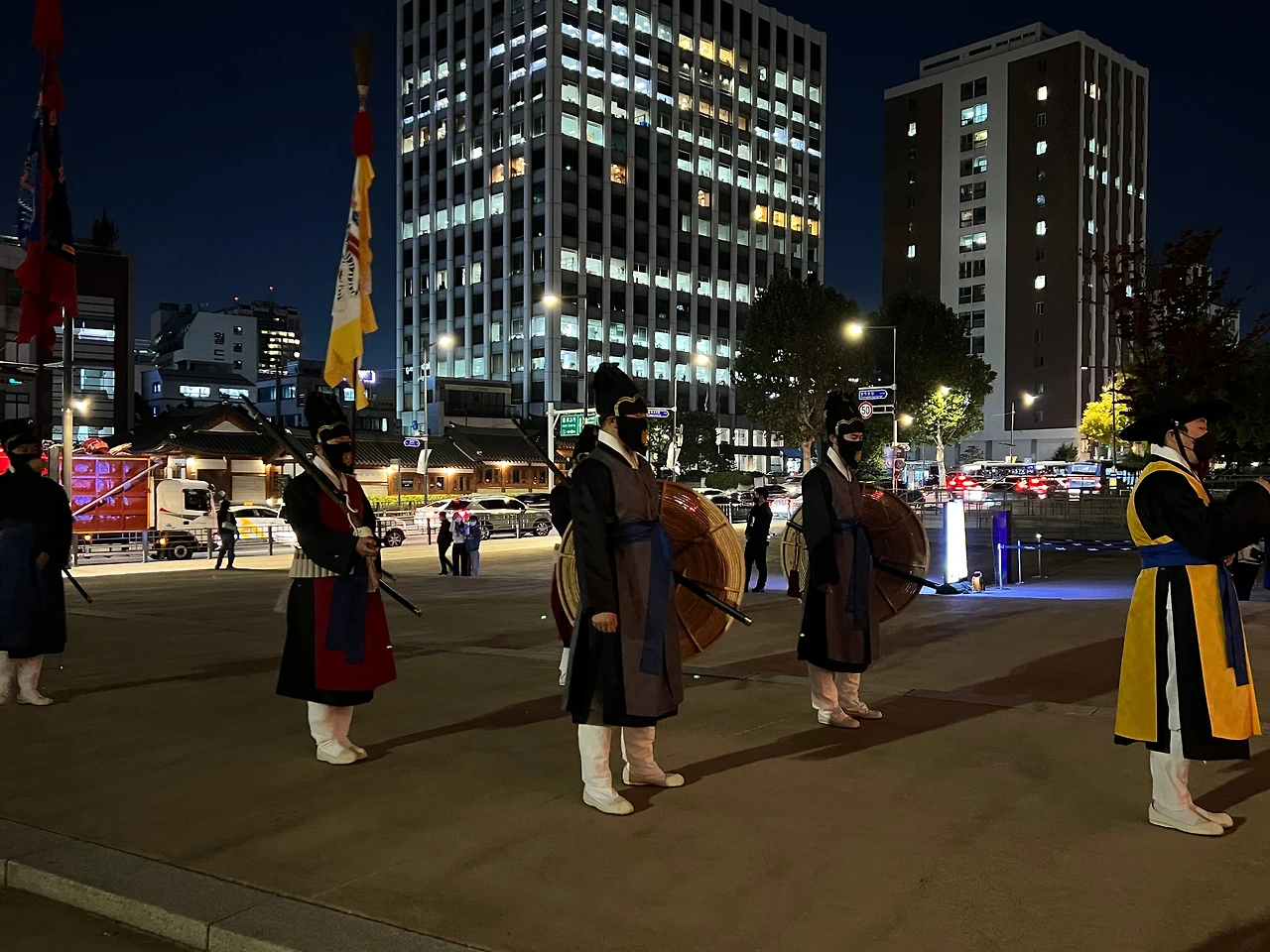 <달빛기행>은 창덕궁의 정문인 돈화문 부근에서 입장 15분 전부터 본인 확인을 진행합니다. 확인을 마치면 돈화문 앞으로 자리를 옮겨 대열에 서서 돈화문이 열리길 기다리죠. 기다리는 동안 나각수의 신호로 수문장들의 행렬이 짧게 진행되고, 정시에 문이 열리면서 담당 해설사가 나타나면 본격적으로 프로그램이 시작됩니다.