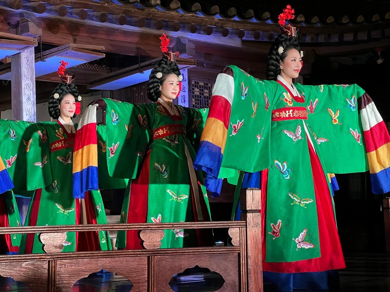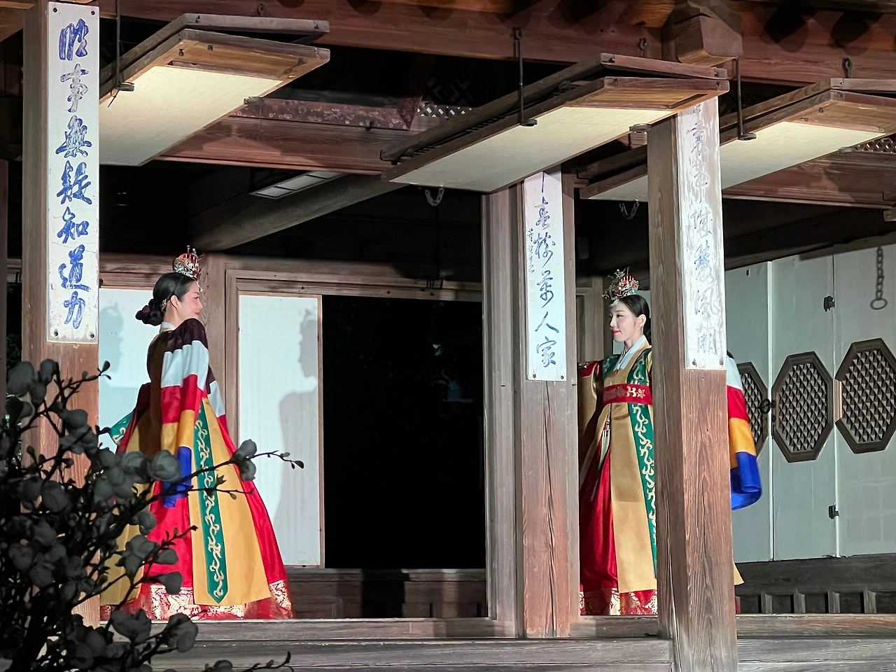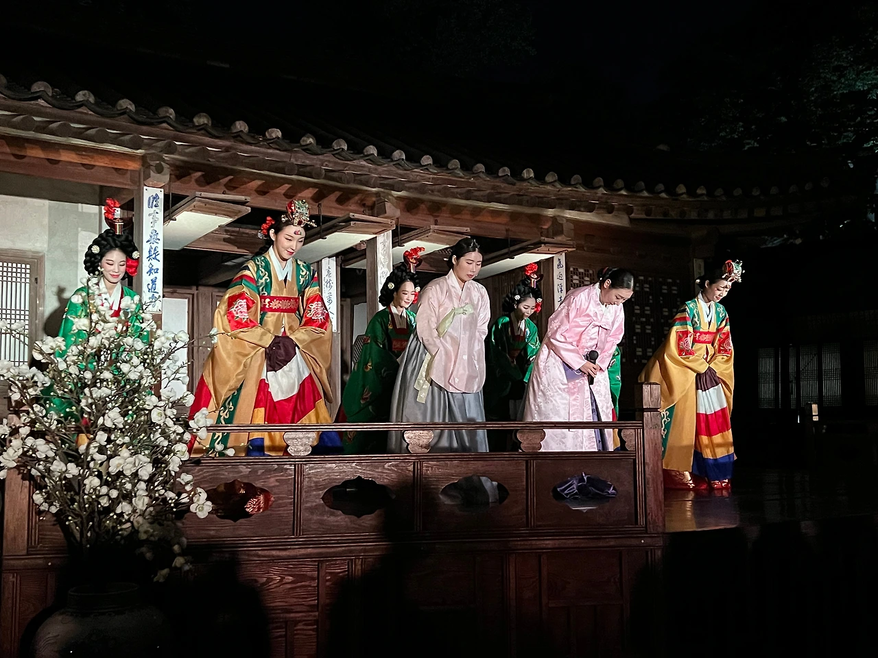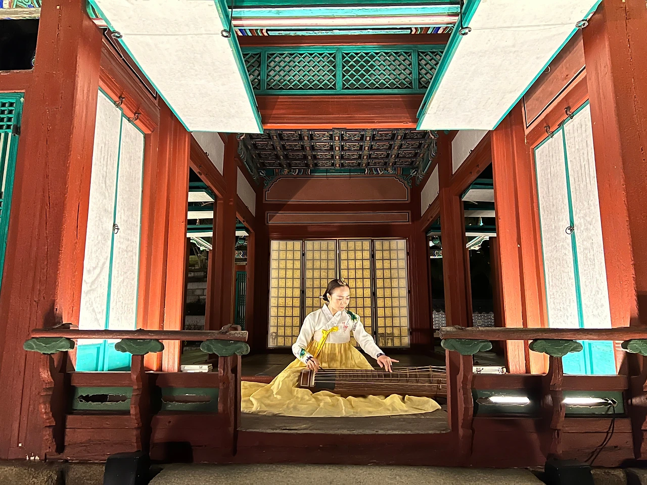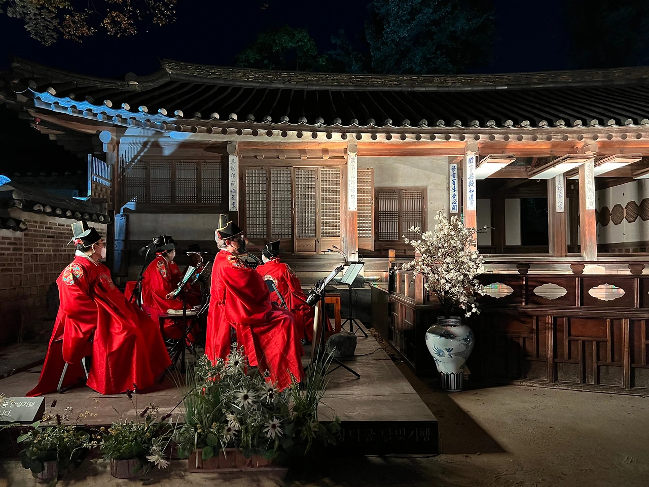 <달빛기행>에선 특정 장소에서 특화된 전통예술 공연과 프로그램을 관람 및 체험하게 됩니다. 몇몇 미개방 지역도 돌아볼 수 있고요. 가령, 전각 지역에선 희정당 외현관이 개방되었고, 낙선재 후원에 우뚝 선 육각형 누각인 상량정은 낮엔 관람이 불가한 지역인데 대금 연주를 들으며 서울 시내를 조망했고. 후원 부용지 근처의 영화당에선 거문고 공연을, 연경당에선 효명세자를 주제로 한 전통예술 공연을 감상했어요. 연경당 공연은 15분 내외로 구성되었는데 이땐 음료도 제공되어 갈증도 해소됐죠.