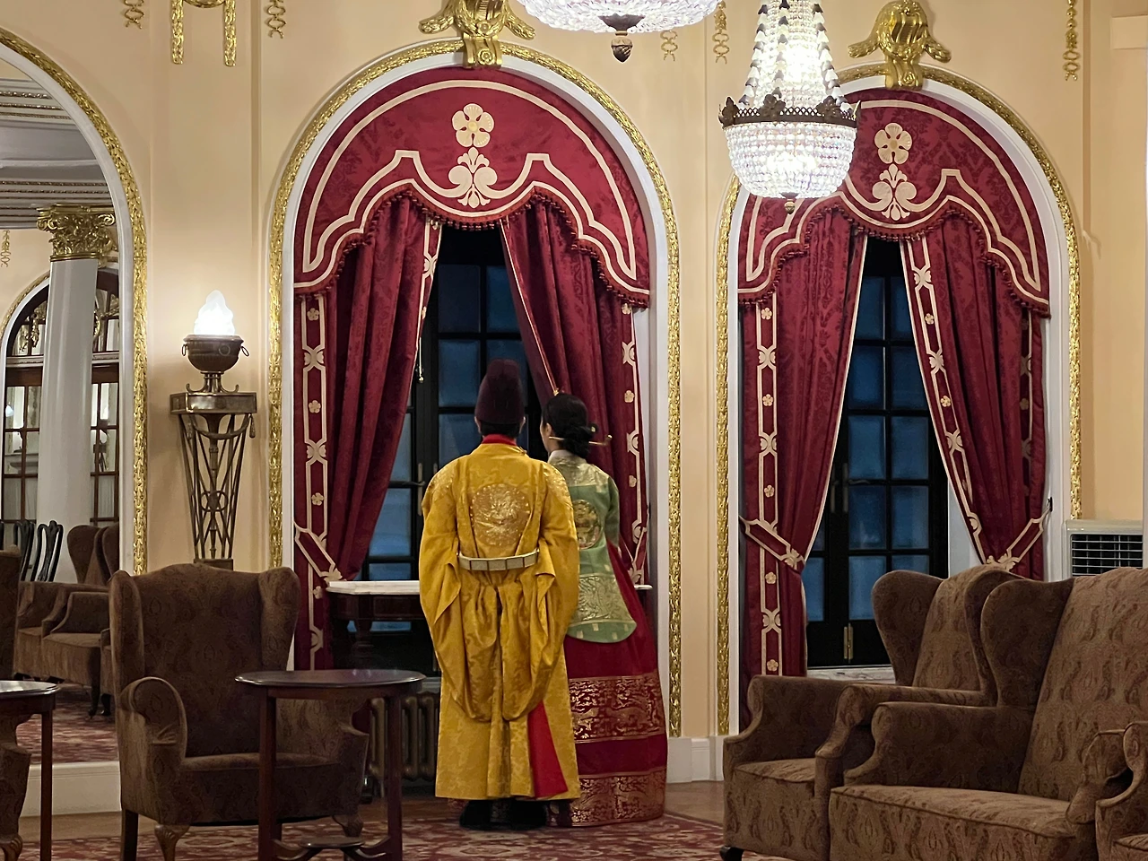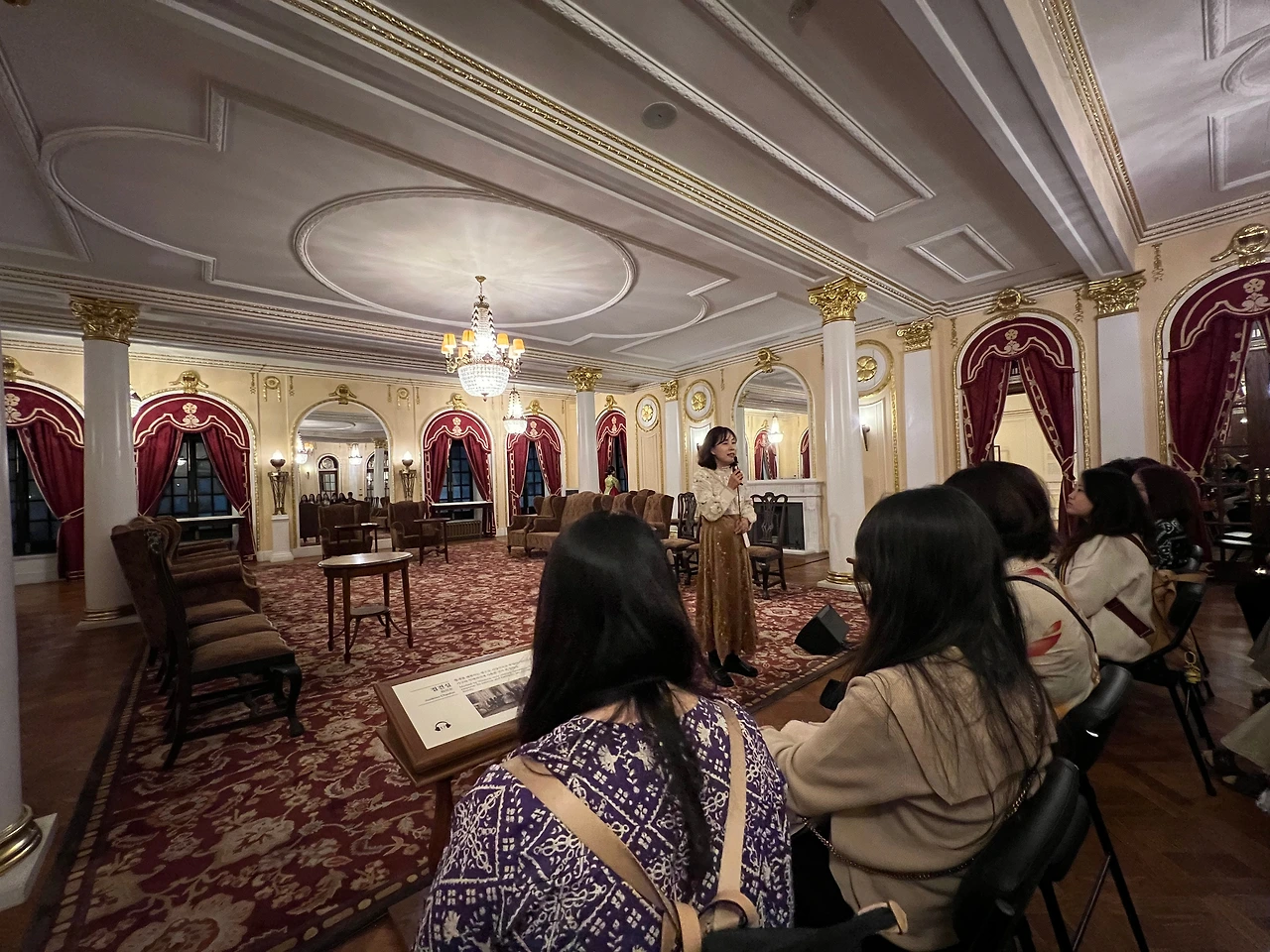 차를 마신 후엔 다시 전문 해설사의 내부 해설이 이어집니다. 2층에서 1층으로 이동하며 나머지 공간들을 둘러봤고, 마지막 장소인 접견실에서 대한제국을 배경으로 펼쳐지는 창작 뮤지컬 <고종-대한의 꿈>의 대표 넘버 3곡을 1열에서 관람했죠. 극 중 고종과 명성황후로 분한 두 배우가 등장해 부르는 <다시 품은 꿈>, <안부>, <대한의 꿈> 3곡은 석조전이 완공되었지만 망국의 길로 접어든 나라를 보며 느낀 무력함과 좌절감, 명성황후에 대한 그리움, 대한의 이름으로 다시 역사를 이어갈 의지를 드러내는 고종의 모습을 엿볼 수 있는 곡이었는데, 석조전에서 들으니 그 내용이 더 절절하게 다가오며 감동도 배가 되었어요.
