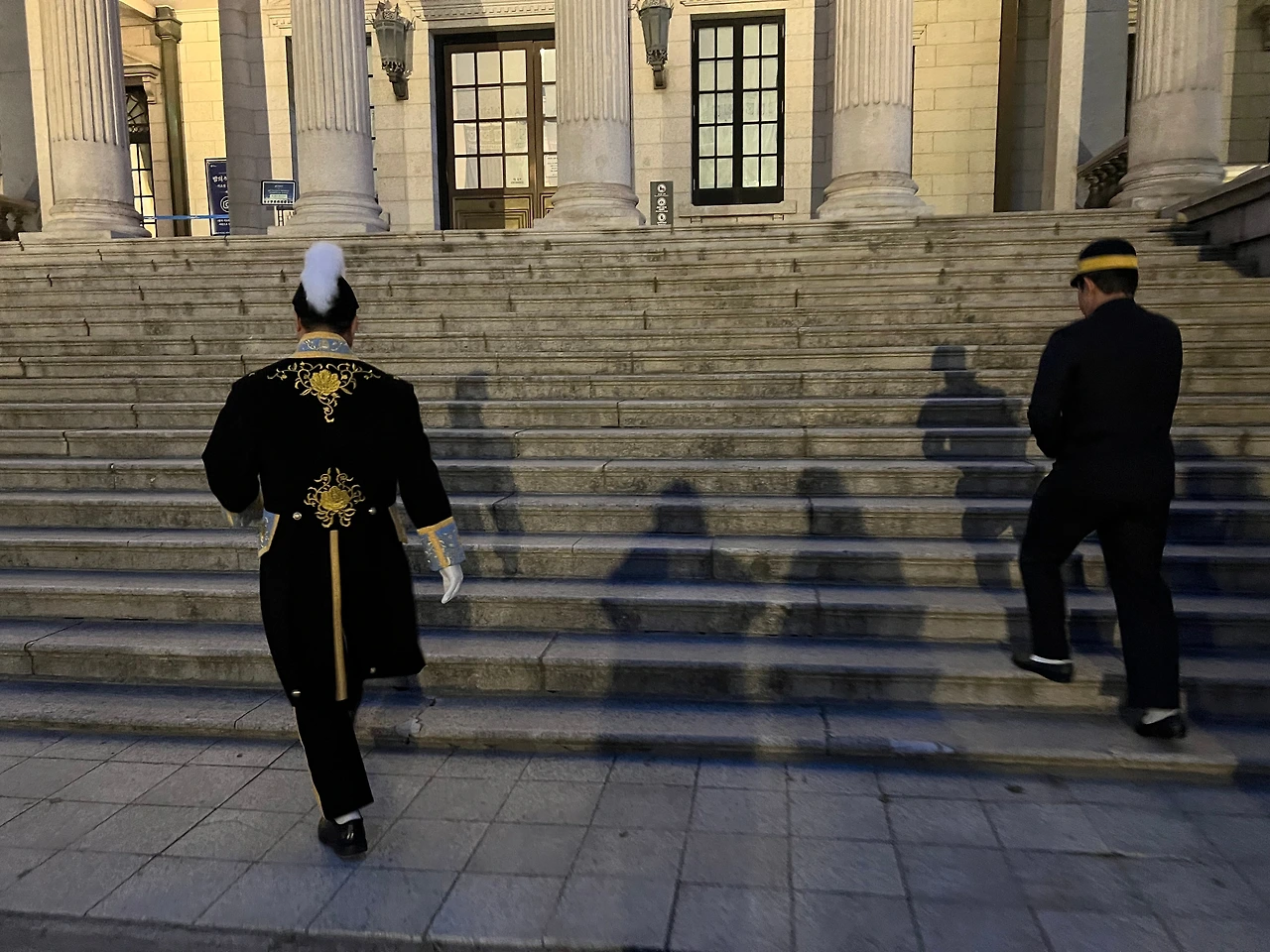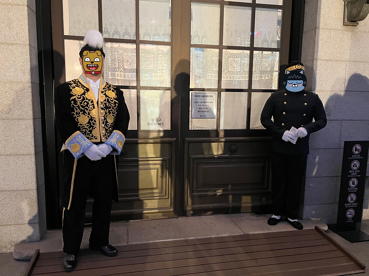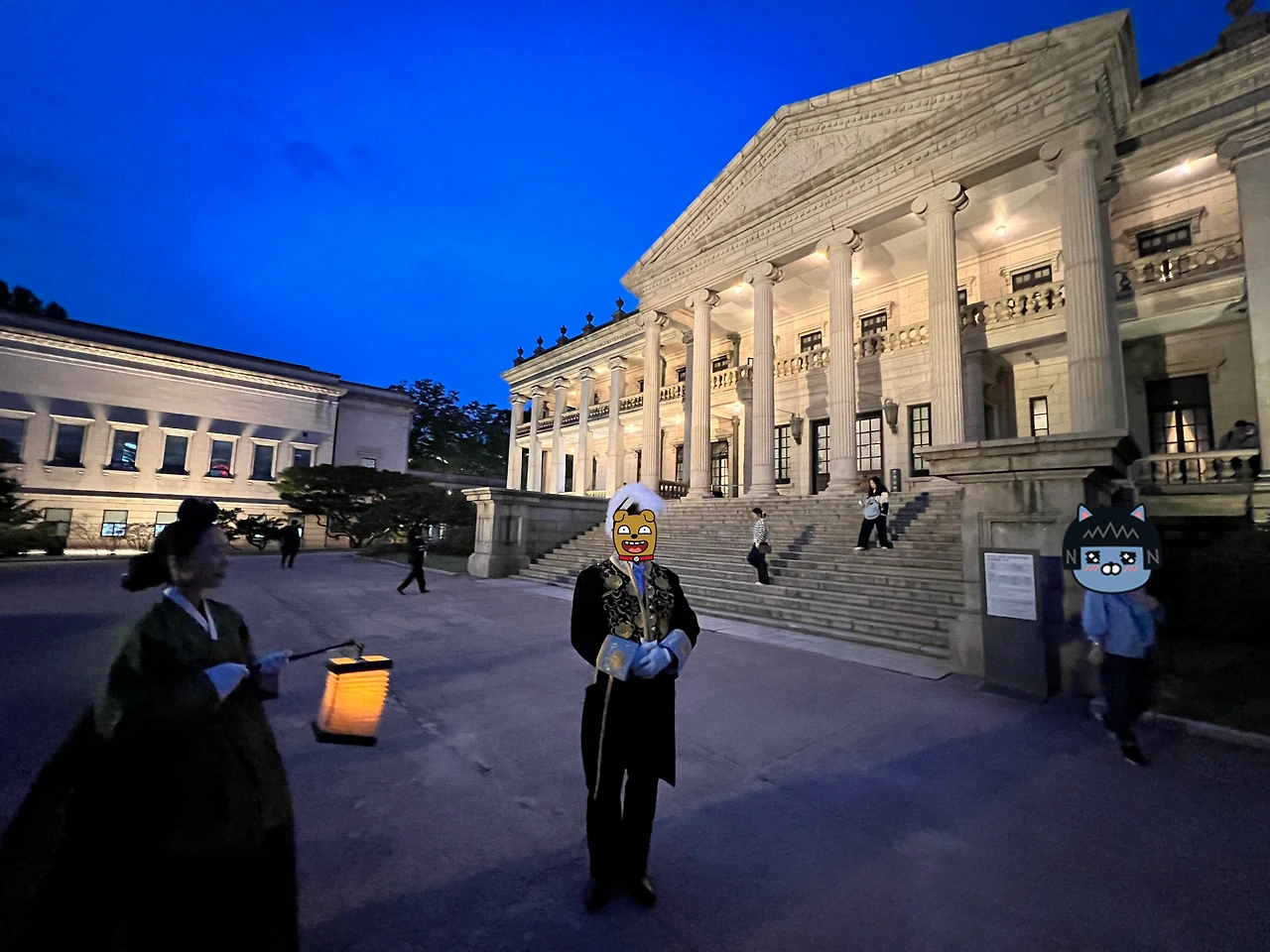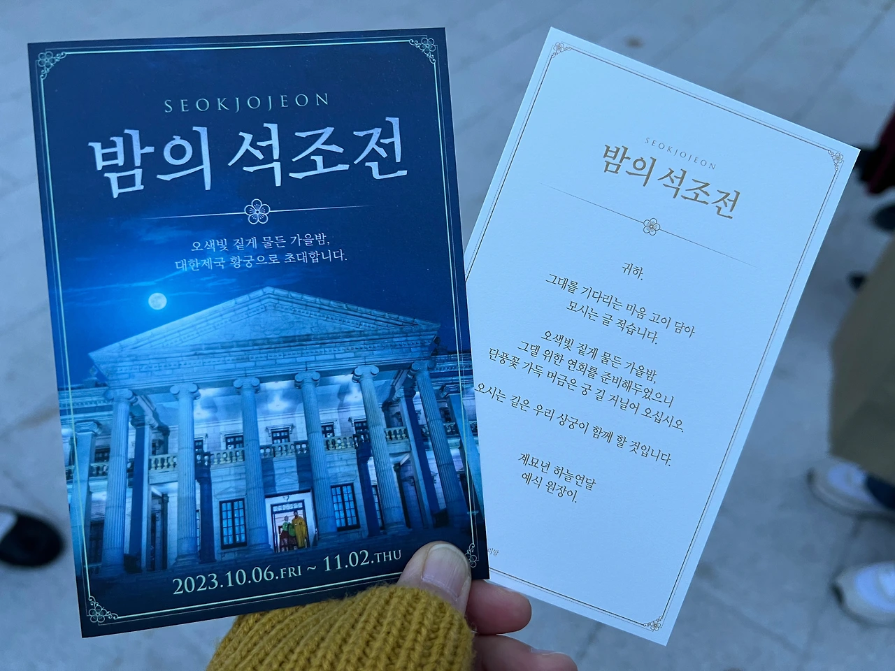 <밤의 석조전>은 아직 생소한 분이 많을 텐데, 그도 그럴 것이 2021년 시범 사업 후 반응이 좋아 2022년 정식 개최되었고, 올해 상·하반기 연 2회로 회차가 늘었어요. 현재 대부분의 궁 야간 체험 행사는 신청자가 많아 사전 추첨제로 예매가 진행되는데, 만 65세 이상 및 장애인, 국가유공자는 회차 별 선착순으로 1인 2매까지 전화로 선착순 예매가 가능합니다. 어쨌든 저도 사전 접수를 하긴 했지만 사실될 거란 생각은 못 했는데, 다행히 예매권에 당첨되어 송부된 예약 링크를 통해 2인(1인 26,000원)의 체험비를 지불하고 실 예약을 마무리했죠. 10월 6일부터 11월 2일까지 진행되는 이 행사는 오후 6시 20분, 6시 50분, 7시 25분 일 3회 전문 해설사와 함께 석조전 야간 전시 및 역사 해설, 석조전 테라스에서 클래식과 차와 간식을 즐기는 테라스 카페 체험, 접견실에서 창작 뮤지컬 ‘고종-대한의 꿈’을 감상하는 90분 일정으로 구성됐어요. 행사 당일 집결 장소인 덕수궁 대한문 앞에서 예약 상황과 신분증을 확인한 후 순검을 따라 궁 안으로 들어가 수신기를 받으며 2차 예약 확인까지 마치면 본격적으로 프로그램이 진행됩니다.