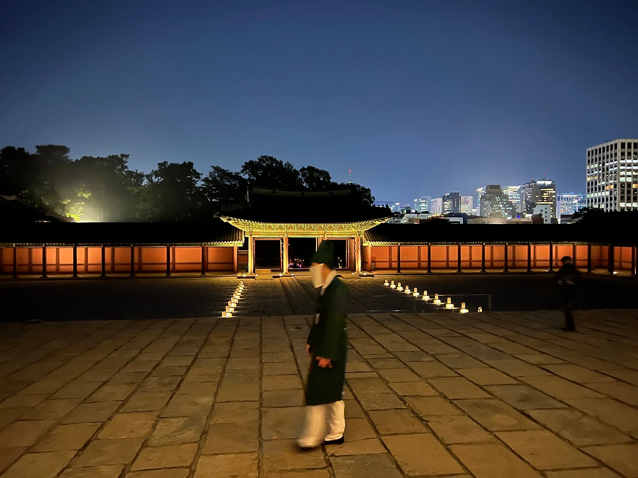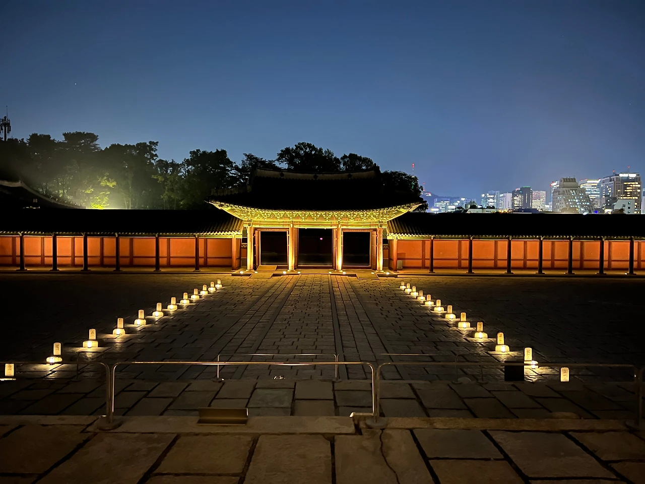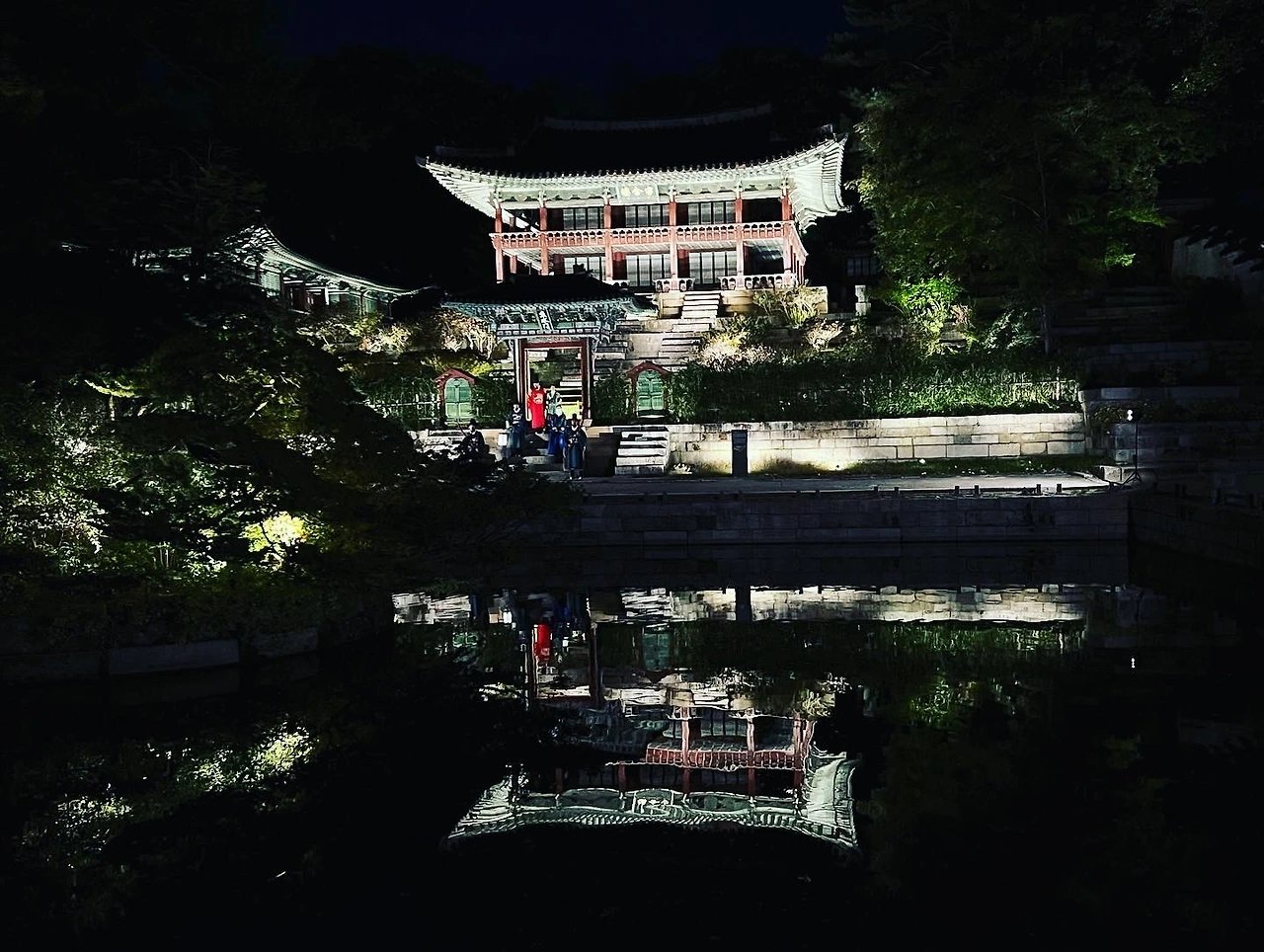 회차당 한 개 조에 25명씩 2개 조(50명)가 5분 간격으로 입장하는데, 돈화문을 통과해 안으로 들어서면 2인당 한 개씩 청사초롱을 나눠줘요. 켜고 끄는 스위치가 있어 사용이 편한, 현대식 청사초롱입니다. 프로그램은 조별로 전문 해설사와 함께 돈화문 → 진선문 → 인정전 → 희정당 → 낙선재 → 상량정 → 부용지→ 애련정과 애련지 → 연경당(공연) → 후원 숲길 → 돈화문의 순서로 약 100분간 관람이 이뤄집니다. 사실, 별거 아닌 듯해도 소수의 인원이 전문 해설사의 안내로 넓고 고요한 고궁을 여유롭게 돌아보는 경험은 꽤 특별합니다. 도심의 현란한 불빛에서 멀어져 우리 역사를 되새기는 동안 특별한 사람이 된 듯한 기분이 들거든요. 낮의 복잡함과는 다른 편안함이 있어 문화재에 더 집중하게 되고, 낮에는 보지 못했던 것들을 적절하게 가려주는 어둠이 있어 오히려 본질에 더 가깝게 다가갈 수 있고요.