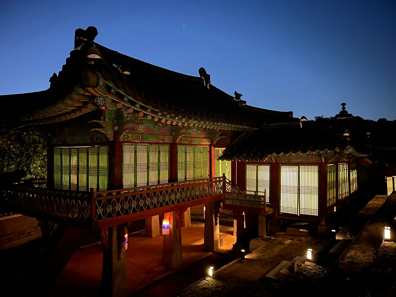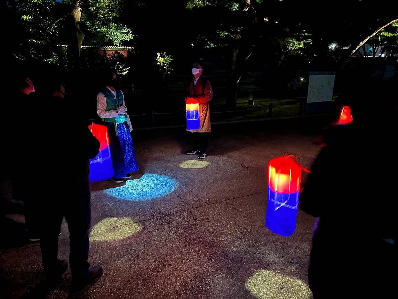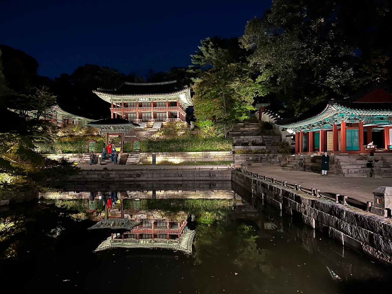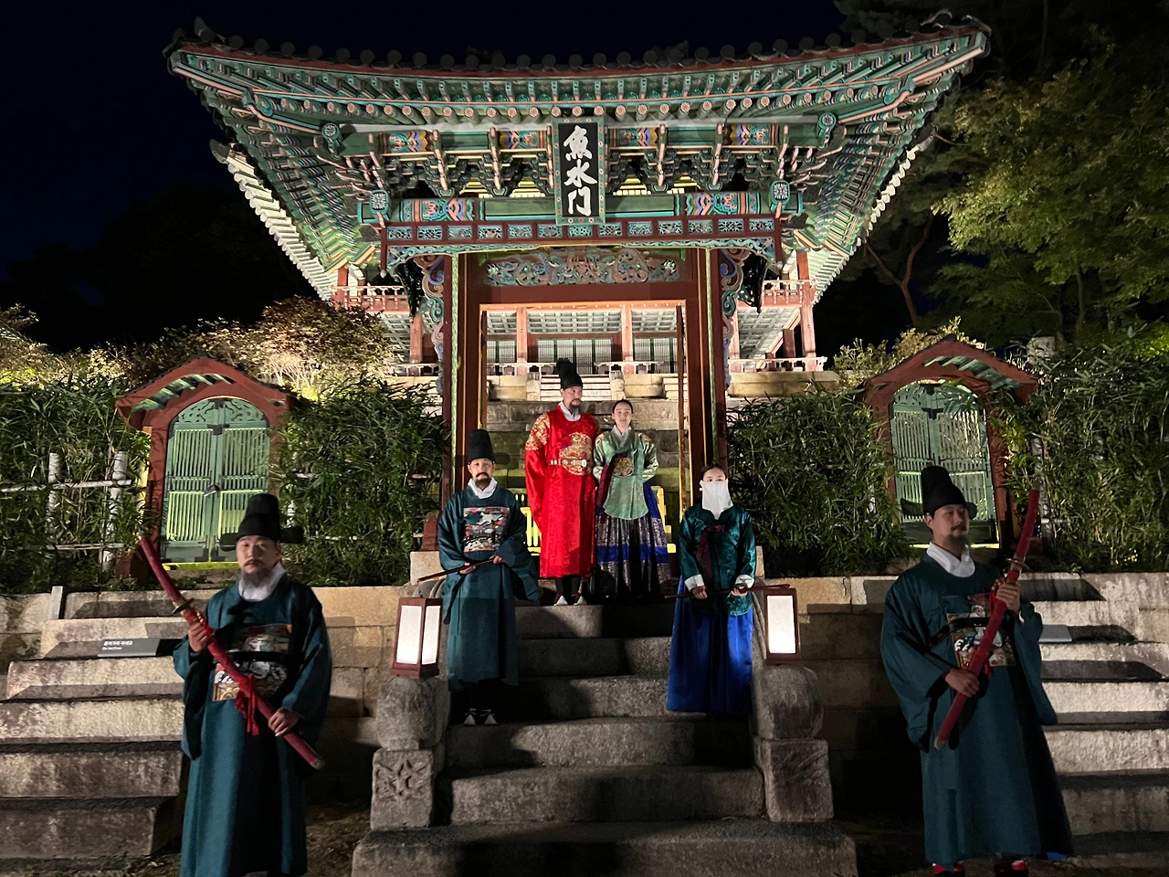 회차당 한 개 조에 25명씩 2개 조(50명)가 5분 간격으로 입장하는데, 돈화문을 통과해 안으로 들어서면 2인당 한 개씩 청사초롱을 나눠줘요. 켜고 끄는 스위치가 있어 사용이 편한, 현대식 청사초롱입니다. 프로그램은 조별로 전문 해설사와 함께 돈화문 → 진선문 → 인정전 → 희정당 → 낙선재 → 상량정 → 부용지→ 애련정과 애련지 → 연경당(공연) → 후원 숲길 → 돈화문의 순서로 약 100분간 관람이 이뤄집니다. 사실, 별거 아닌 듯해도 소수의 인원이 전문 해설사의 안내로 넓고 고요한 고궁을 여유롭게 돌아보는 경험은 꽤 특별합니다. 도심의 현란한 불빛에서 멀어져 우리 역사를 되새기는 동안 특별한 사람이 된 듯한 기분이 들거든요. 낮의 복잡함과는 다른 편안함이 있어 문화재에 더 집중하게 되고, 낮에는 보지 못했던 것들을 적절하게 가려주는 어둠이 있어 오히려 본질에 더 가깝게 다가갈 수 있고요.