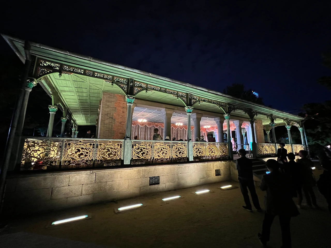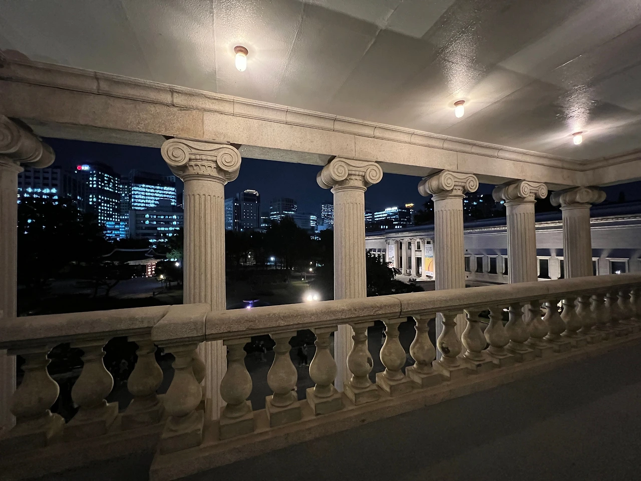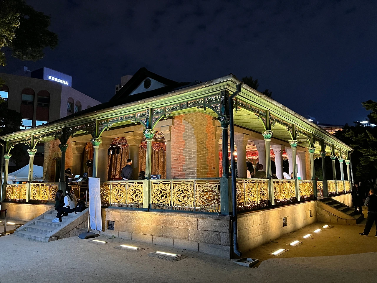 정관헌 역시 밤에 봐도 예쁜 궁궐 내 전각입니다. 조선 역대 왕의 초상화인 어진을 봉안했던 장소로, 팔작지붕에 서양식의 차양칸과 난간이 있고 난간에는 사슴, 소나무, 당초, 박쥐 등의 전통 문양이 조각되어 있어 언제 봐도 새롭고 멋있다. 정관헌에서는 명사초청 강연이나 공연 등이 종종 진행되는데, 관련 행사 정보는 덕수궁 누리집을 참고하세요.