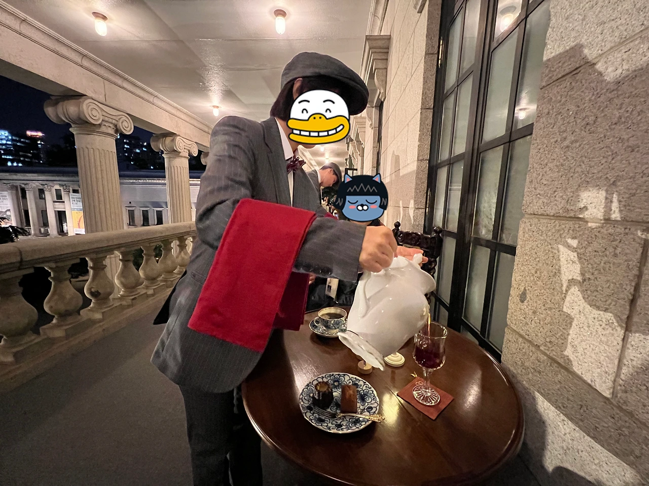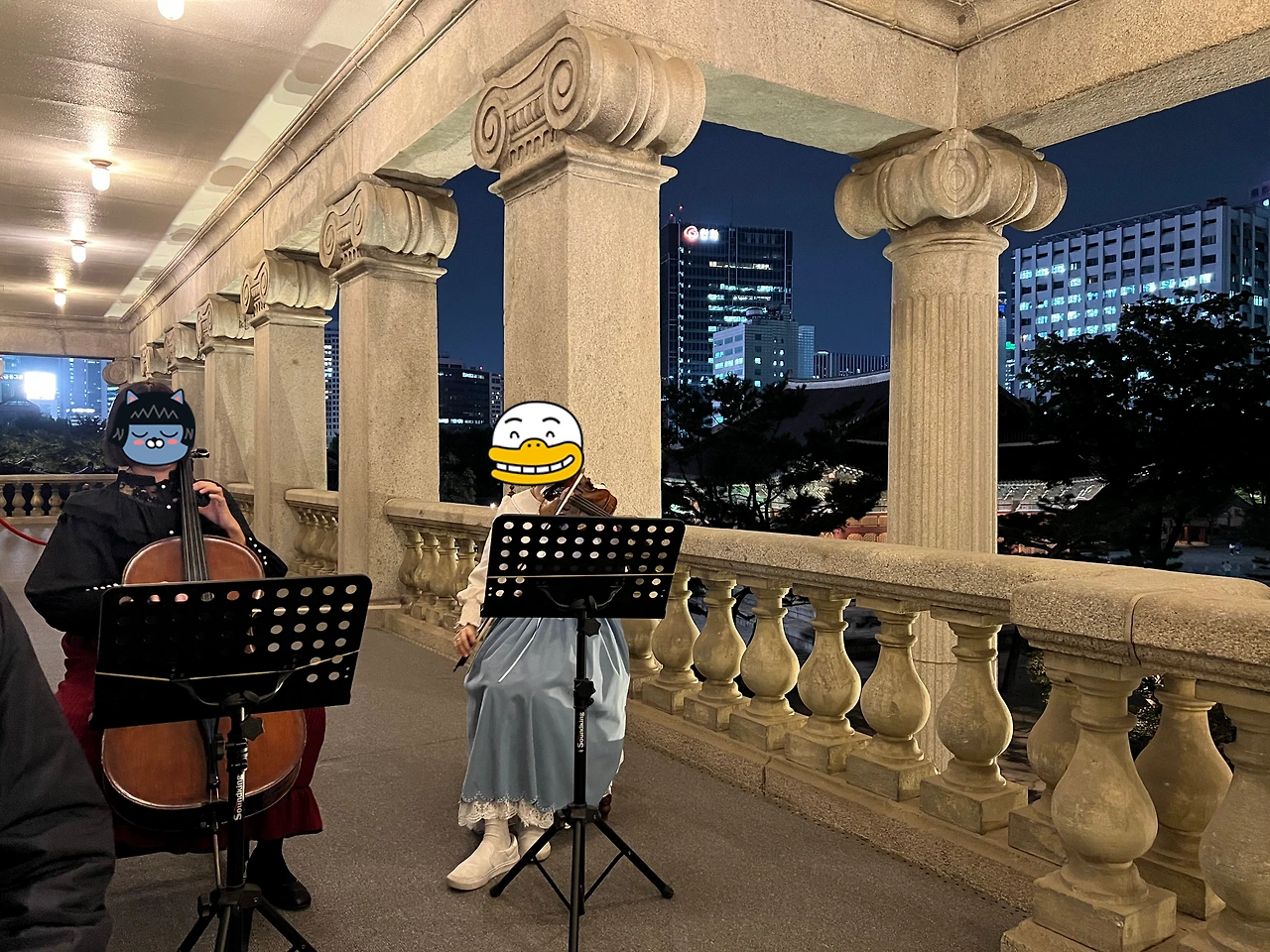 해설 중반쯤 찾아온 휴식시간은 더 특별했어요. 휴식시간 역시 프로그램의 하나로, 이 시간엔 석조전 테라스에서 눈으로는 덕수궁의 야경을 보고, 귀로는 클래식 음악을 들으며, 입으로는 가배차와 서양식 후식(까눌레와 휘낭시에)을 맛보는 ‘테라스 카페 체험’이 진행됐거든요. 가배차(咖啡茶)는 당시 커피의 영어 발음에서 따온 말로 ‘가배차’ ,‘가비차’, ‘양탕국’으로도 불렸는데, 당일 예쁜 찻잔에 제공된 커피는 후식과 잘 어우러져 참여자들의 입을 즐겁게 했죠. 또 커피를 못 마시는 관람객들을 위해 새콤달콤한 상심자차(桑椹子茶, 오디)도 준비되었는데, 쌀쌀한 날씨에 달짝지근한 풍미가 부담스럽지 않게 입안을 가득 채워, ‘한 잔 더’를 외치고 싶을 정도로 맛있었습니다. 대부분의 관람객들이 옷을 잘 챙겨 입고 왔지만, 혹시나 추위를 느끼는 관람객들을 위해 무릎 담요와 핫팩도 구비되어 편안하게 즐겼고요.