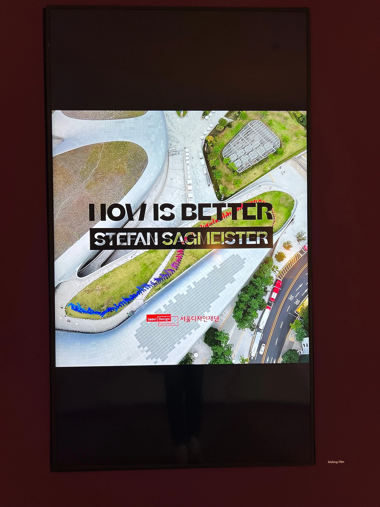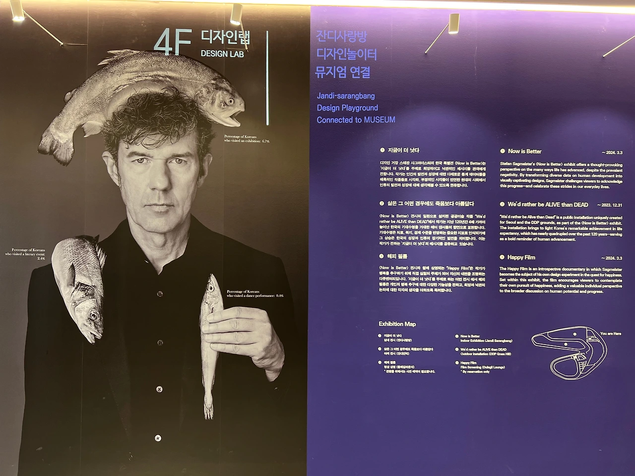 그중에서 오늘 소개할 전시는 디자이너 스테판 사그마이스터의 《 NOW IS BETTER(지금이 더 낫다)》로, 전달하는 메시지와 구성도 좋은데, 실내 전시와 실외 전시, 상영시간 95분의 다큐멘터리 영화도 무료로 볼 수 있어 더 좋습니다. 전시와 영화는 디자인 랩 4층에서 진행되는데, 특별한 관람 순서가 있는 건 아니지만 먼저 전시장으로 이동해 전시를 보고, 야외 설치작인 <We’d rather be alive than dead( 삶은 그 어떤 경우에도 죽음보다 아름답다)>를 본 후 다큐멘터리 영화인 <Happy film>을 보길 권합니다. 저는 딱 반대로 봤는데, 그렇게 보면 잘 이해가 안 됩니다 ㅎㅎㅎ