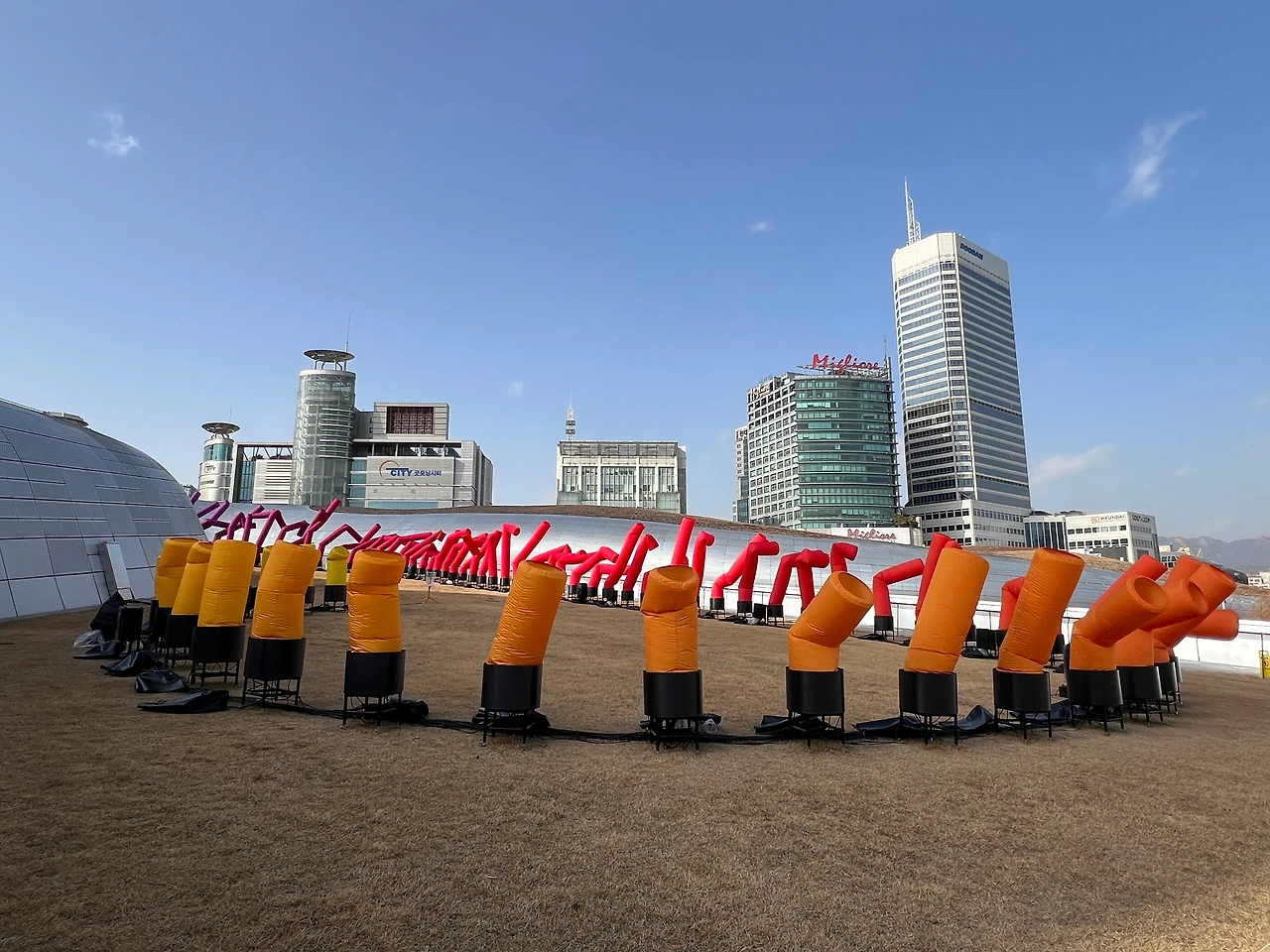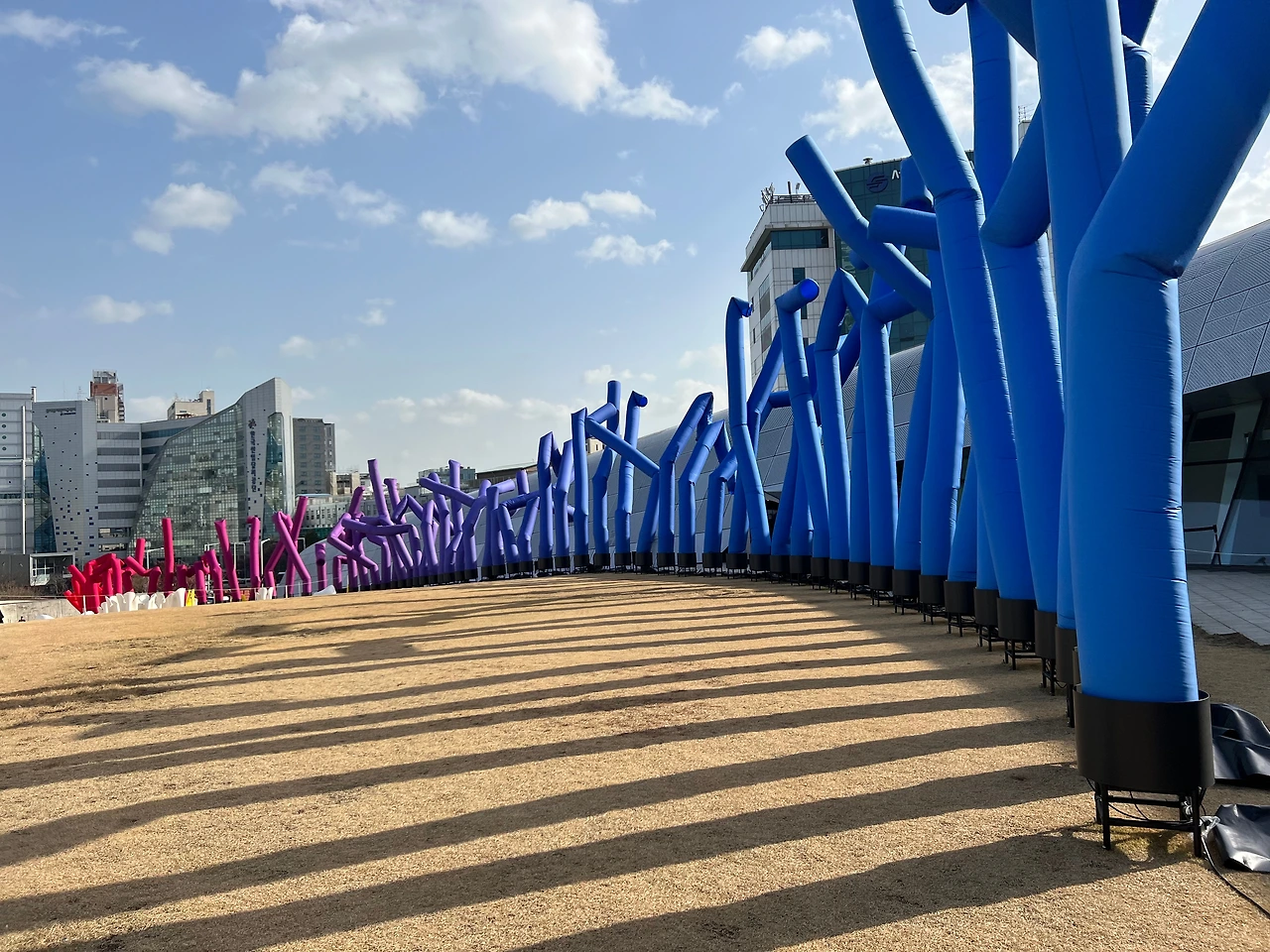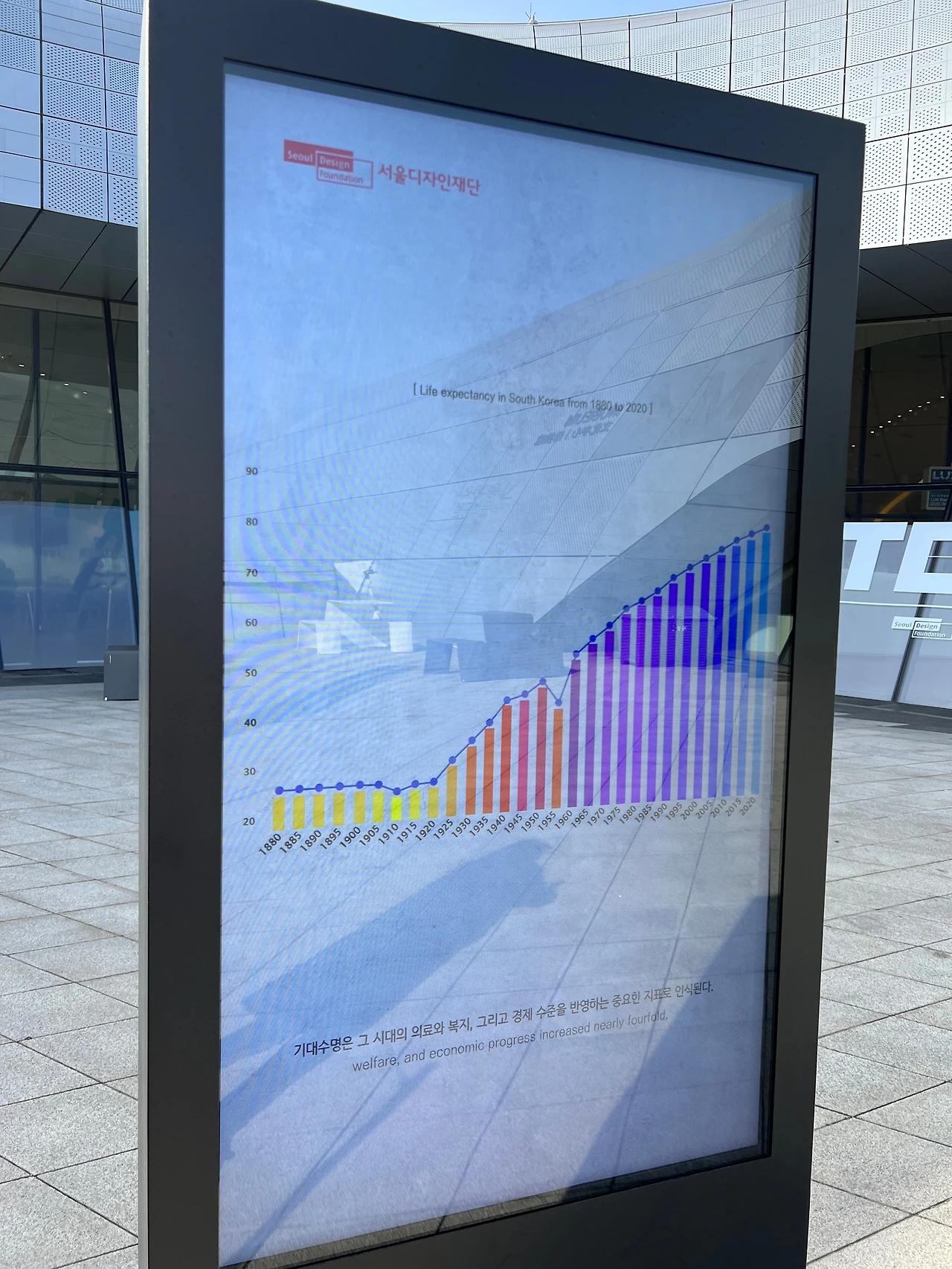 이 작품은 DDP 전시를 위해 특별 기획되어 이미 9월부터 선보였는데, 실내 전시와 다르게 올 12월까지만 볼 수 있으니, 보고 싶다면 서두르셔야 합니다. 긴 막대형 조형물의 외형은 주유소나 개업 상점 앞에서 호객용으로 설치된 에어 댄서에서 디자인 요소를 가지고 와서 처음 보는 작품이지만 눈에 아무 친숙합니다. 작품 초입에 있는 모니터에도 설명이 있지만, 이 작품은 “UN에서 발표한 데이터 중 발견한 지난 120년간 한국의 기대수명 데이터의 추이를 보며, 한국의 기대수명이 지난 120년 동안 거의 4배 가까이 증가하여 전 세계 국가 중에서도 가장 큰 폭으로 증가했고, 기대수명이 그 시대의 의료와 복지, 경제 수준을 반영하는 중요한 지표로 인식되며, 이 급격한 상승은 대한민국이 얼마나 빠르게 성장했는지를 보여준다"라는 내용을, 열린 공간에 막대그래프처럼 시각화하여 보여주고 있죠. 제작 과정은 실내 전시장에서 확인할 수 있어요.