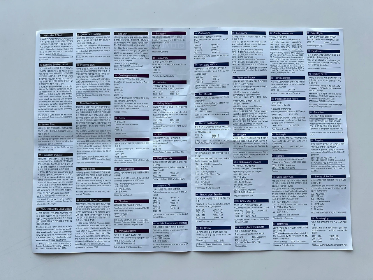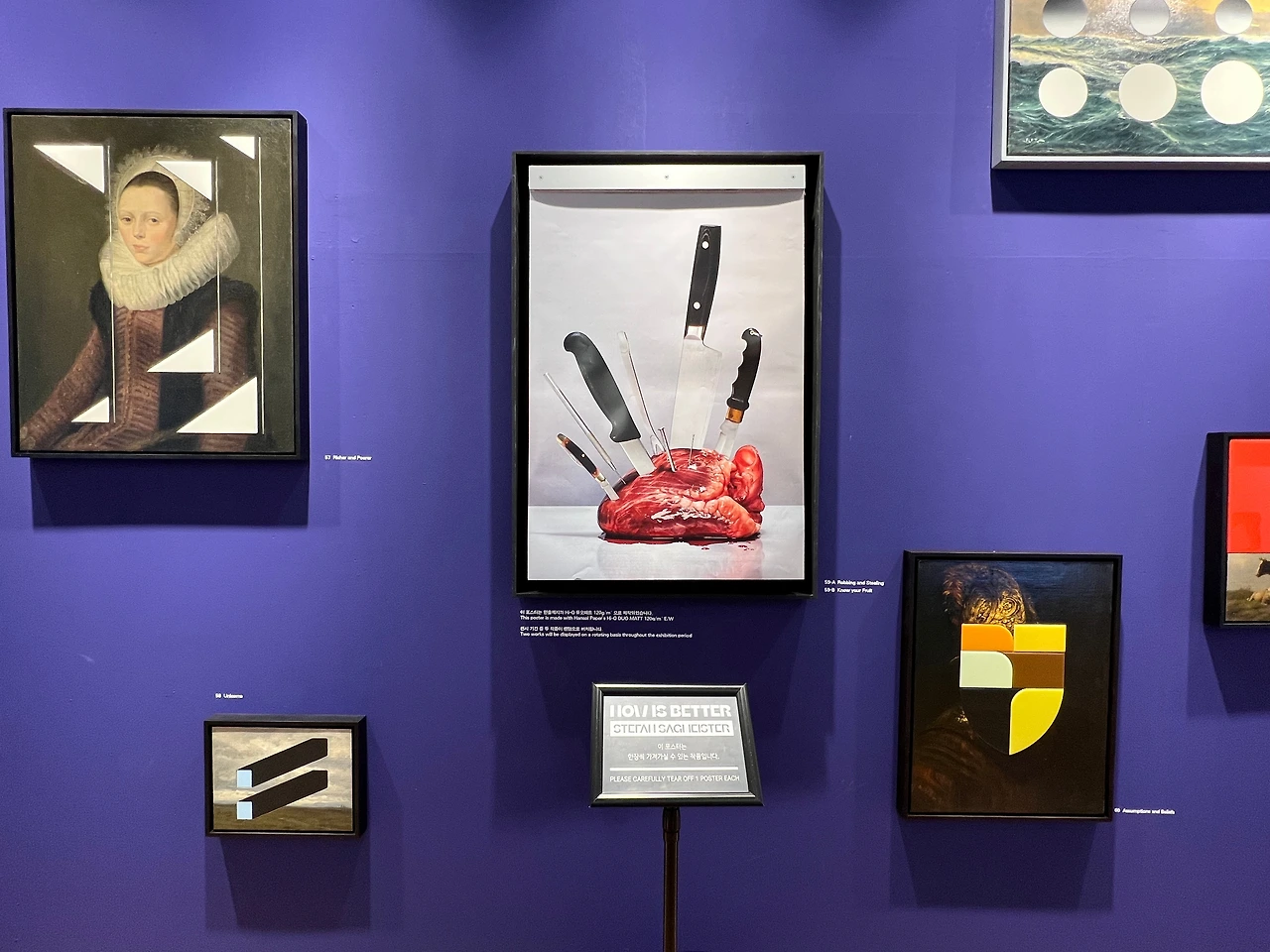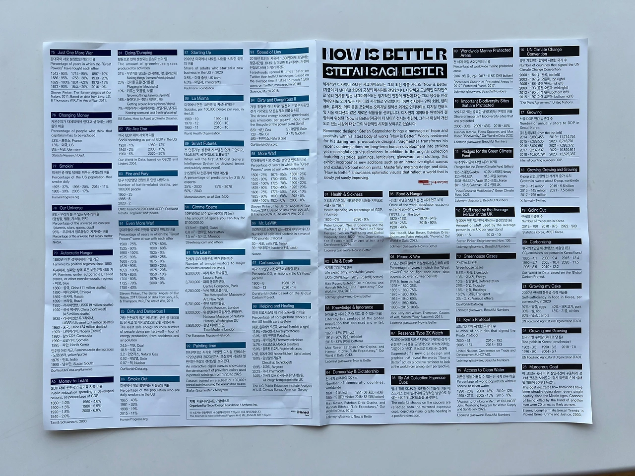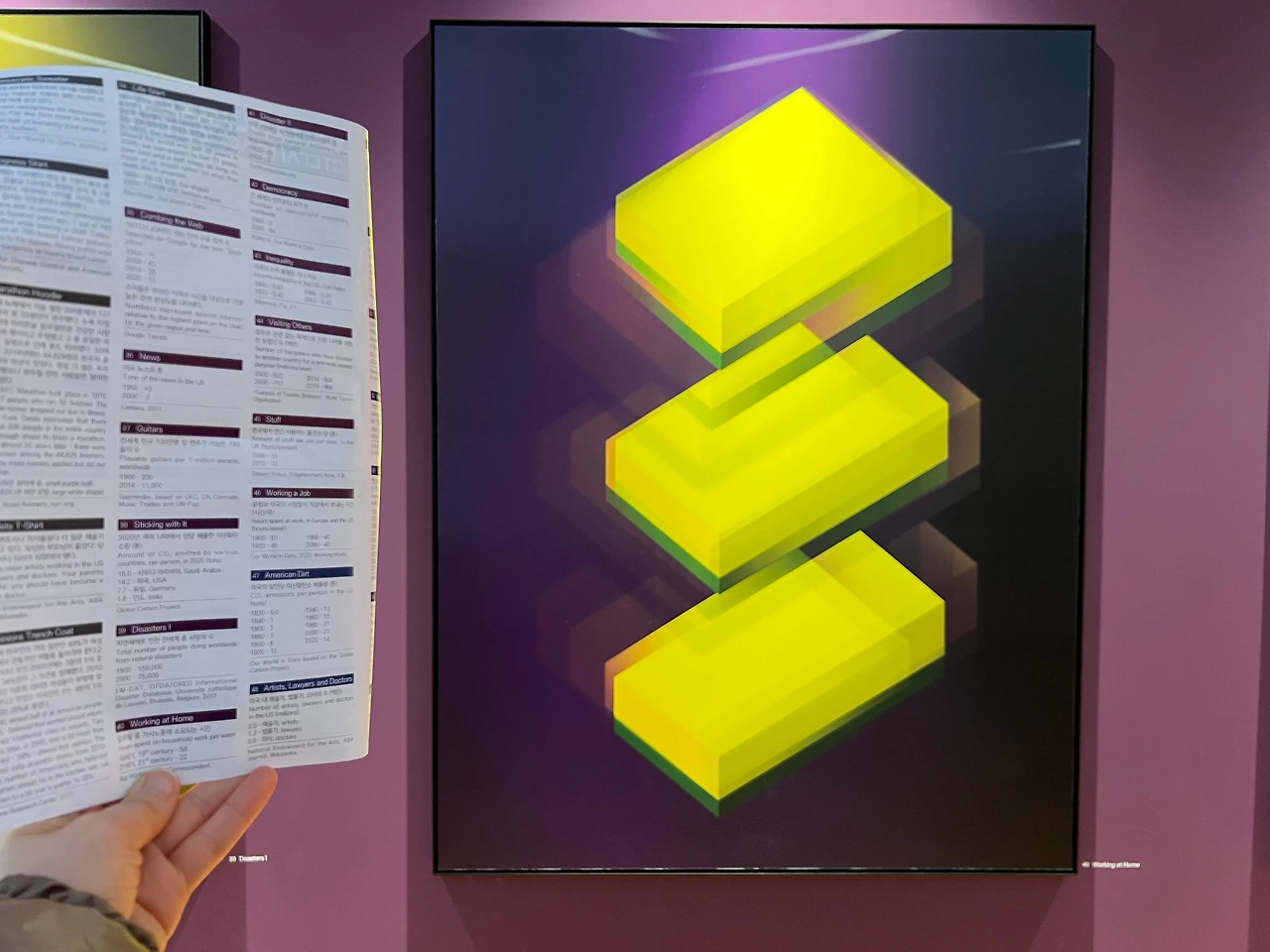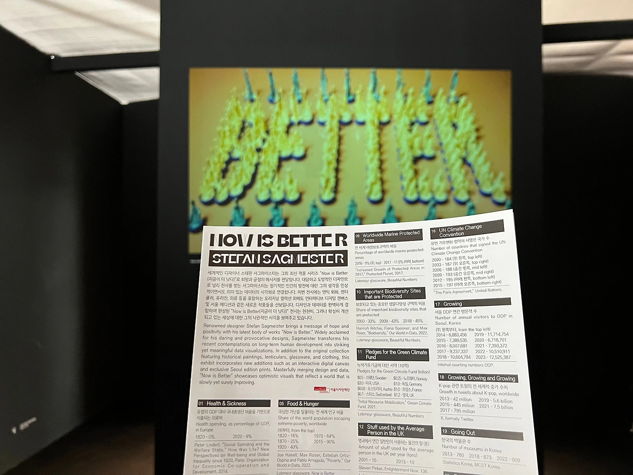 어쨌든 그가 확인한 객관적인 데이터는 작품 속에서 색과 면 등의 디자인 요소로 표현되어 있는데, 전시 캡션이 따로 붙어있지 않으니 전시장 입구에서 나눠주는 관람 자료를 꼭 받으셔야 합니다. 안 주면 인포데스크에서 가져다가 보셔야 해요. 안내 자료 번호에 기재된 번호와 작품 번호를 대조해 보지 않으면 어떤 통계를 기반으로 만든 건지를 전혀 이해할 수가 없거든요. 또 이번 전시만을 위해 특별히 한국의 데이터를 적용한 ‘서울 DDP 연간 방문객 수’, ‘한국의 박물관 수’와 같은 서울 에디션 작품 5점도 있는데, 절대로 알아낼 수가 없어요, 안내 자료가 없다면. 아! 전시실에 있는 영상도 봐두셔야 합니다, 그렇게 길진 않아요.