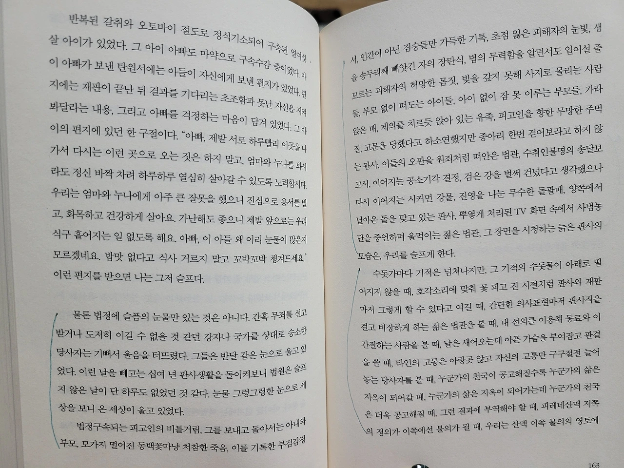 나는 요즘 조직의 부속품으로서 생사의 담대한 진실 앞에 무력하게 서 있는 나 자신이 하찮아 견딜 수가 없다.하찮은 외피에 짓눌렸던 슬픔은 기침처럼 터져 나왔다. 변호사 출신의 승포판(승진을 포기한 판사)이라는 작가가 늘어놓은 슬픔의 군상에 눈물을 뚝뚝 흘렸다. 이렇게 많은 슬픔을 짊어지고 판단의 고뇌를삭여 '양형 이유'에 녹여낸 그의 글에 자꾸만 눈물이 나니 벌써 갱년기인가 싶었다.