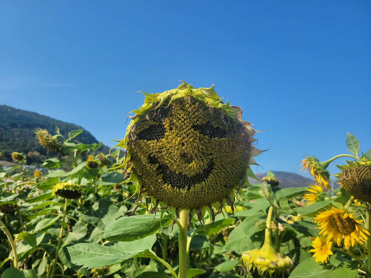 11월 타들어가는 태양에 목을 뻗은 해바라기 군중과 기이하게 웃으며 시들어가는 해바라기 한 송이.