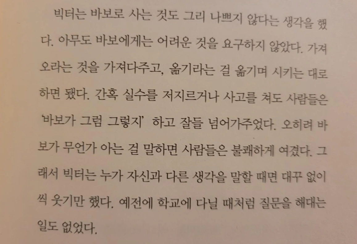 어렸을 적, 우리 반에 '바보'가 있었다. 어눌한 말투와는 달리 큰 키와 주름진 피부 때문에 '사실은 대학생이다'라는 소문만 무성했다. 아이들은 그 아이를 만지면 더러운 어떤 것이 묻는다는 인식이 있었다. 그것이 단지 놀이였는지, 지나친 상상이었는지 잘 기억나지 않는다.