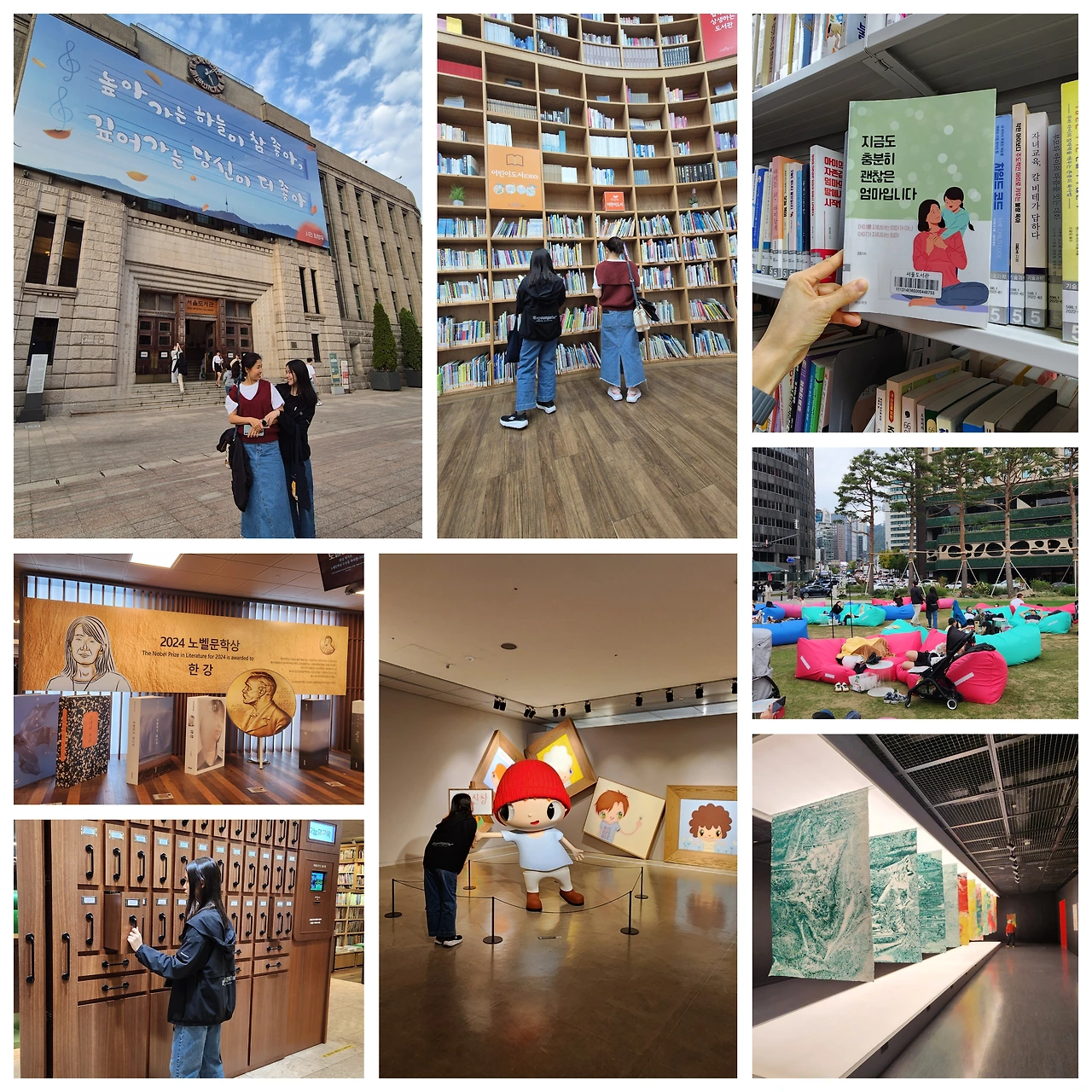 한강 작가의 수상소식을 듣고 도서관에서 책을 빌려보려고 했지만, 예약자가 너무 많아 빌릴 수 없었다. 근데 이곳에 한강 작가책이 있었다. 밤 9시까지 야외도서관은 운영된다며 읽고 반납하면 된다고 했다. 담요도 무료대여다. 딸과 함께 감탄하며 서울 도서관 안으로 들어가 보았다.