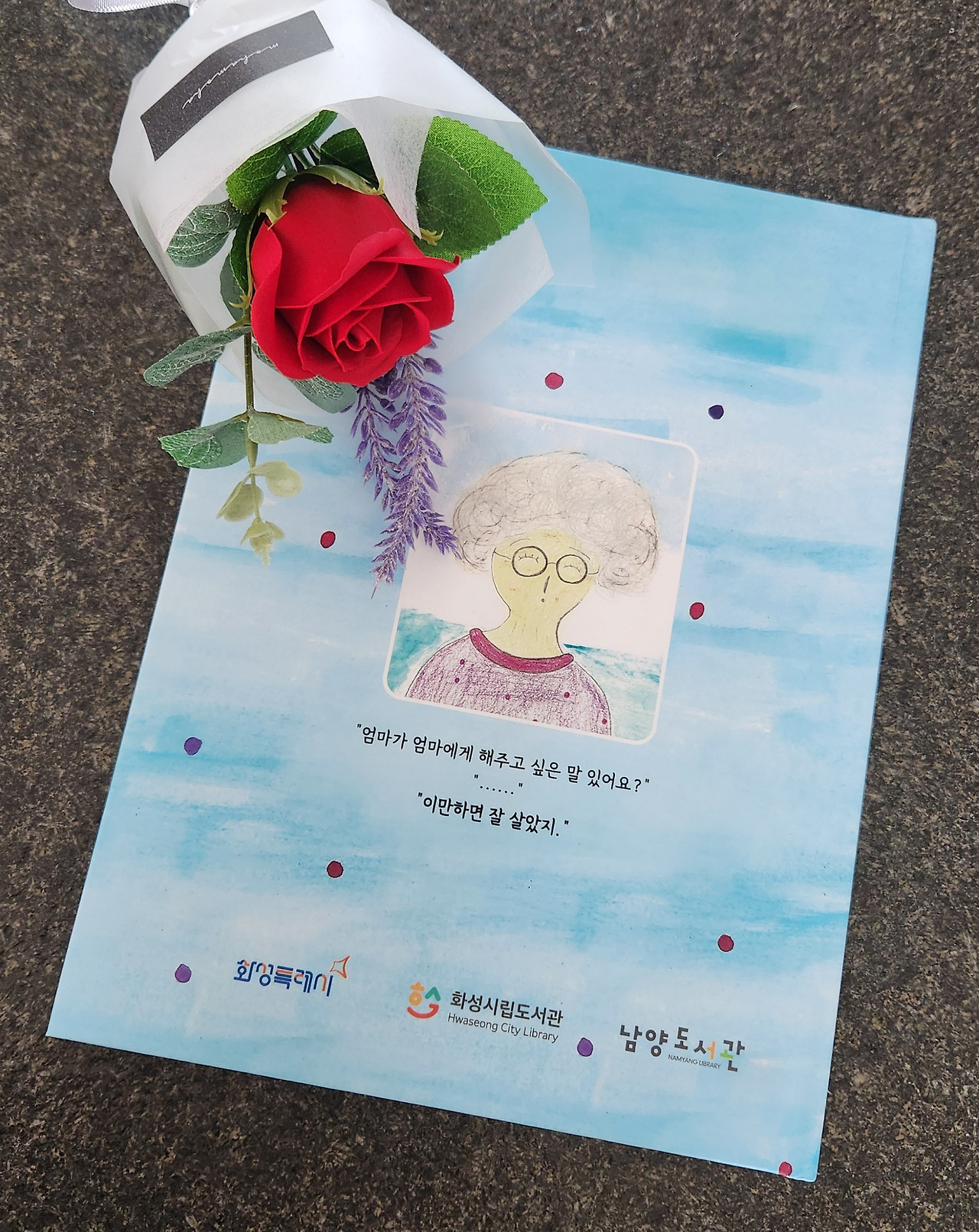작년 12월 여든이 된 엄마만을 위한 그림책을 만들어드렸다. 현재 도서관에 전시 중이라 같이 구경을 갔다. 엄마와 똑 닮은 표지에 웃음이 나온다. 인증사진을 찍고, 다시 집으로 향했다.