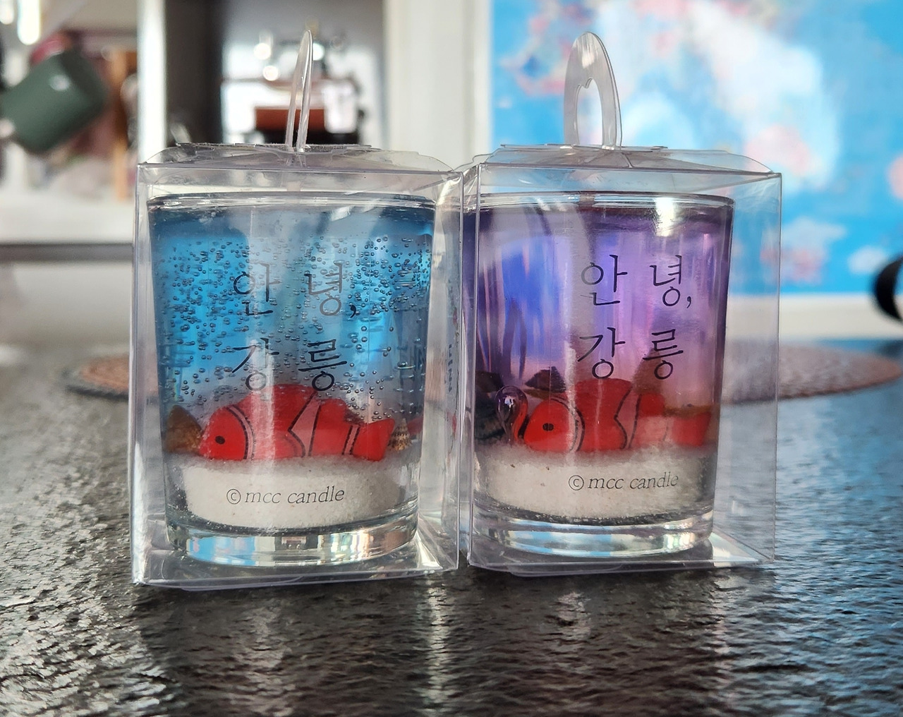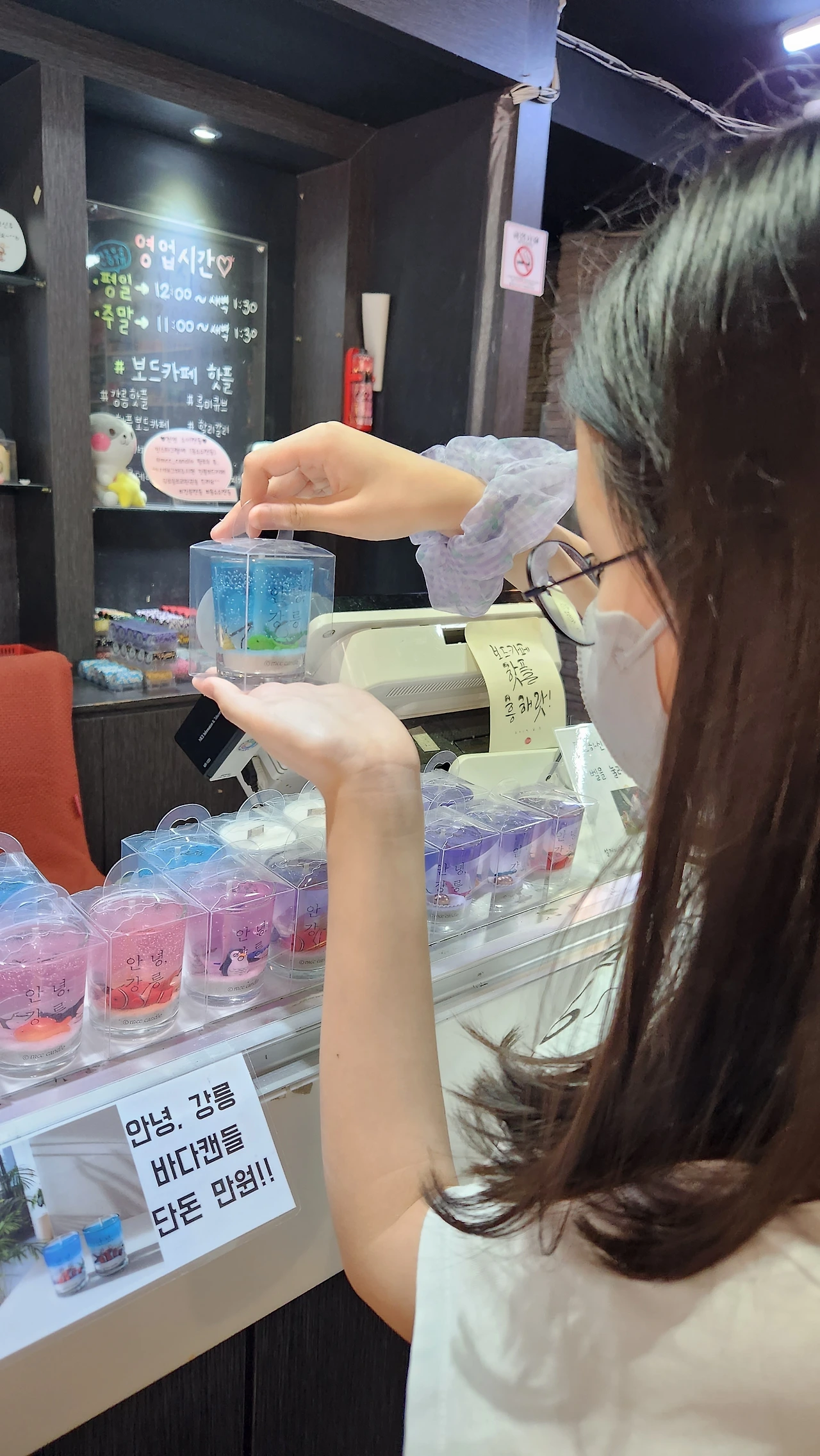 친구에게 선물하겠다며 이것저것을 고민하던 겨울이 눈에 ‘안녕 강릉’이라는 캔들이 적힌 배너가 들어왔다. 겨울은 캔들을 구경하자면서 내 손을 끌어당겨 가게 안으로 들어갔다. 바닷속풍경을 꾸며놓은 모습이 귀엽고 사랑스럽다.