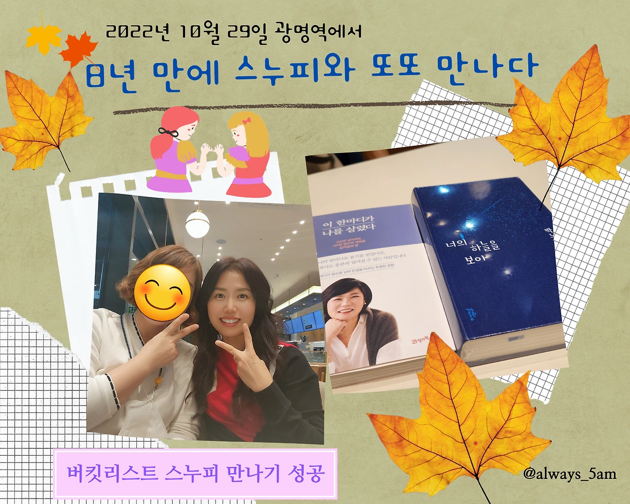 그녀는 언제나 상대의 이야기에 귀를 기울이며 공감의 끄덕임을 전했다. 덕분에 그녀와 통화를 하고 나면 항상 기분이 좋았다. 내가 꽤 괜찮은 사람이 된다. 우리는 그렇게 서로에게 힘이 되는 사이었다. 사춘기시절 나의 비밀친구, 스누피와의 짧았던 5시간의 만남. 아쉬움 가득했지만 잠깐이라도 얼굴을 볼 수 있음에 감사할 뿐이다. 앞으로 1년에 꼭 한 번씩 보자는 다짐과 함께 바로 모임통장을 개설했다.