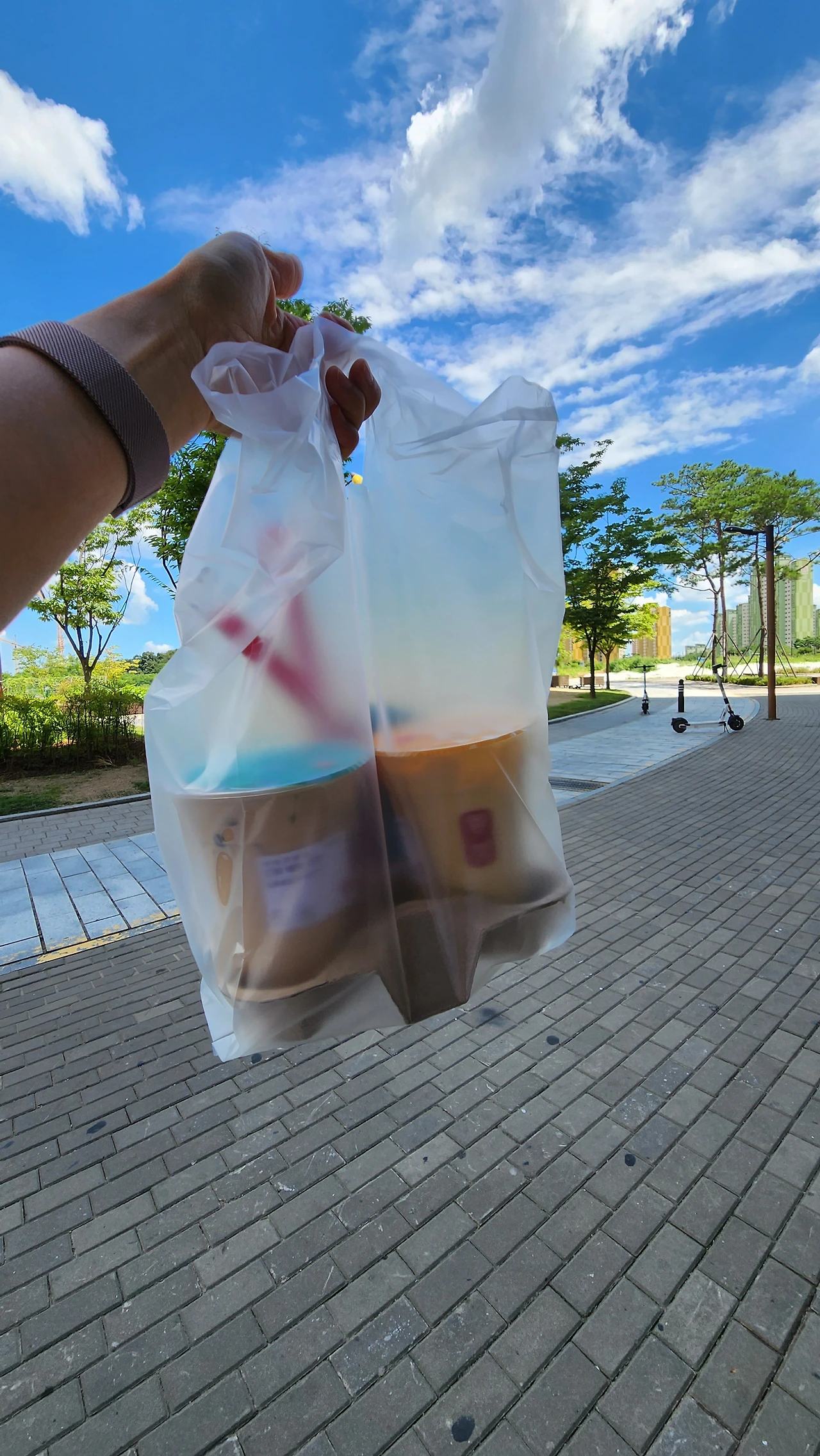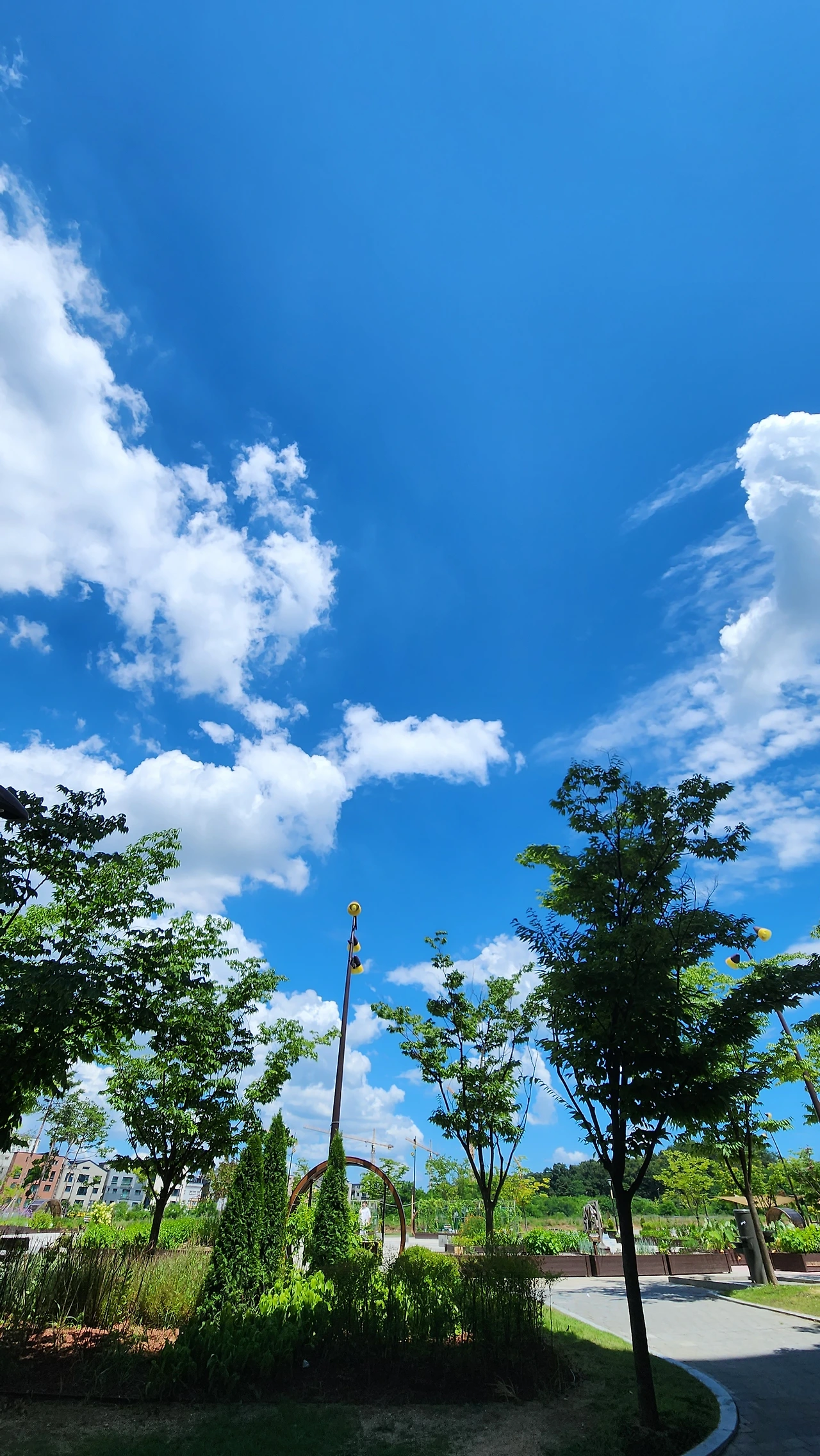 비교하려고 한 건 아니지만 사장님 센스에 미용실에서 상했던 마음이 위로받는 기분이다. 기분 좋게 음료를 받고 나오는데 하늘이 미쳤다. 선명한 파란색에 하얀 구름이 둥실둥실 떠있는 모습은 하나의 예술작품을 감상하는 기분이다. 여러 장의 사진을 찍고, 가족 단톡방에 사진을 남겼다.