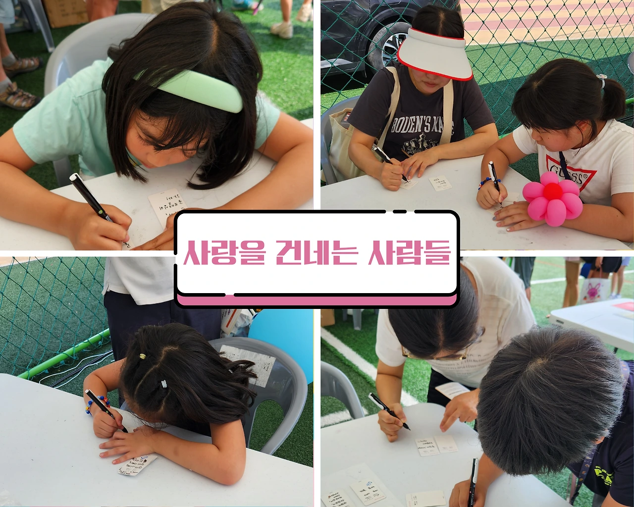 올해는 조금 더 나은 체험을 구성했다. 자신과 타인에게 하고 싶은 말을 적으며 긍정의 말을 전해본다. 예쁜 문구가 들어가 있는 카드에 한 자 한 자 적는 아이들부터 어른들까지 신중하게 고민하는 모습이 인상적이었다. 글자를 모르는 아이들은 그림을 그린다.