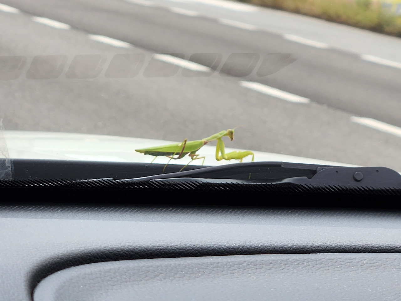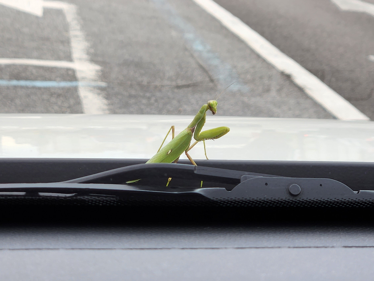 1교시부터 4교시까지 쉼 없이 수업을 마쳤다. 아이들과 환경 이야기를 나누는 시간은 언제나 즐겁다. 요즘 감기가 유행이라서인지 목이 칼칼하다. 차에 앉아 따뜻한 보리차를 마시며 목을 진정시켰다. 아이 간식으로 뭐가 좋을까 생각하던 중 청춘당이 보인다. 오늘 간식은 꽈배기로 정했다. 꽈배기를 사서 한참을 달려오는데 전면 유리에 초록색깔에 뭔가가 보인다. 자세히 보고 싶은데 오늘따라 신호를 잘 받는다. 3개의 신호등을 지나서야 그 녀석의 정체를 발견했다.
