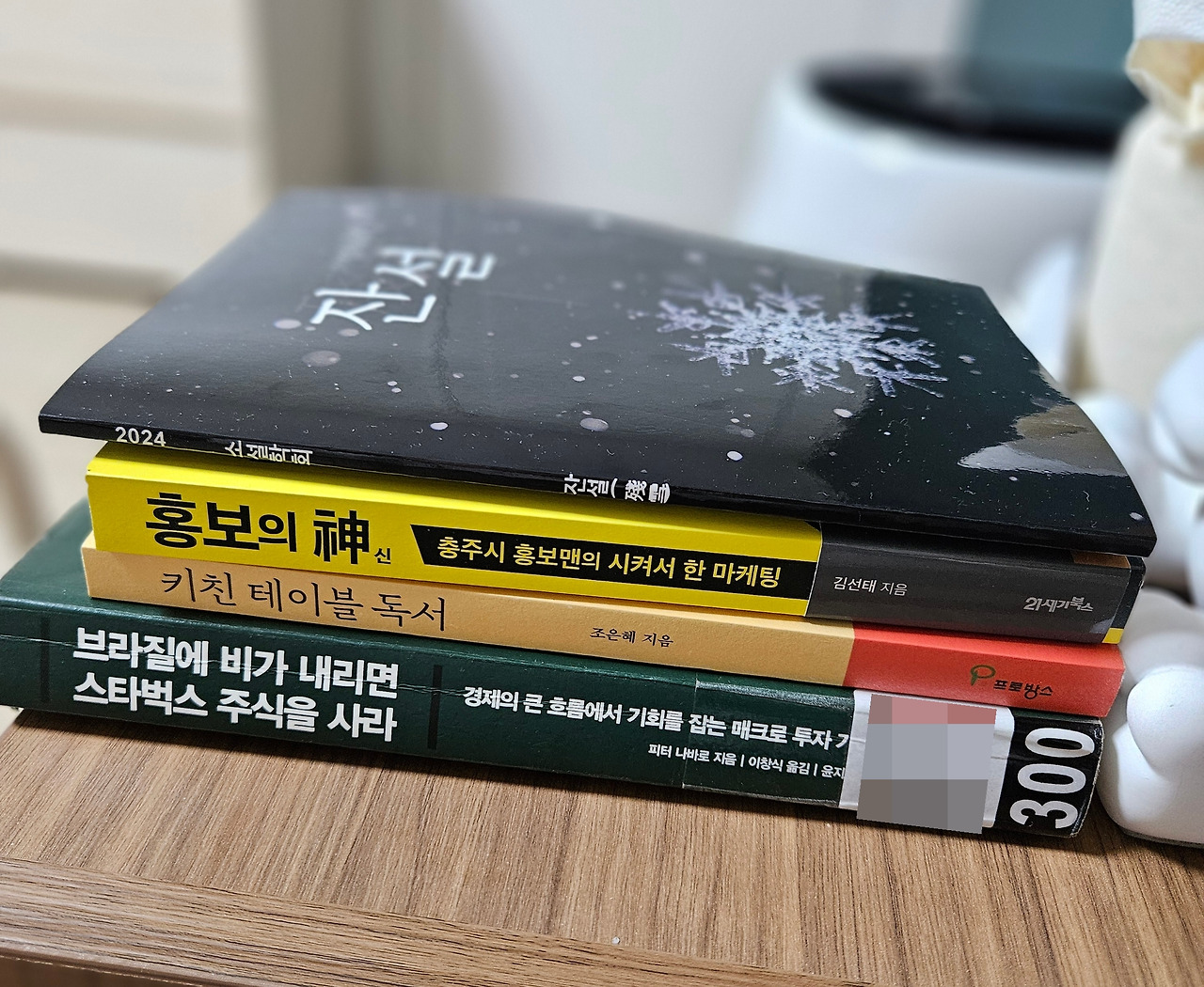 어쨌든 나는 책을 한 번에 딱 한 권만 읽으려고 했다. 빨리 이 책을 다 읽고 그다음에 다른 책으로 넘어가겠다는 식이었다. 이렇다 보니 장점도 있지만 단점도 많았다. 어떤 책은 하루에 한 꼭지만 읽어도 충분한 책이 있었다. 그런 책의 한 꼭지를 다 읽었다면 그날의 남은 시간에는 다른 책을 읽는 게 효과적인 독서일 것이다. 하지만 나는 고집스럽게 여러 꼭지를 읽으려다가 결국 흥미를 잃어버리는 경우들이 있었다. 하지만 작가는 2부의 '키친 테이블 독서 꿀팁 보따리'에서 '수확의 독서'에 대해 안내한다. '은행 예금 풍차 돌리기'의 예를 들며 여러 책을 조금씩 읽어나가면 일정 시간이 지난 후에 첫 번째 책을 완독하게 되고 줄줄이 여러 책을 완독하게 된다는 것을 알려준다. 마치 농부가 봄에 여러 씨앗을 뿌리고 가을이 되어 수확물을 거두어들이는 것과 같다고 한다. 정말 좋은 방법이 아닐 수 없었다. 나에게 낯선 분야의 책들은 오랜 시간 진득하게 읽기가 힘들다. 그러나 짧게 한 꼭지씩을 읽는 건 어렵지 않다. 다른 책도 조금만 읽고 넘어가도 되는 거다. 이 사실을 깨달은 후부터 나는 침대 옆에 두세 권의 책을 더 갖다 놓았다.