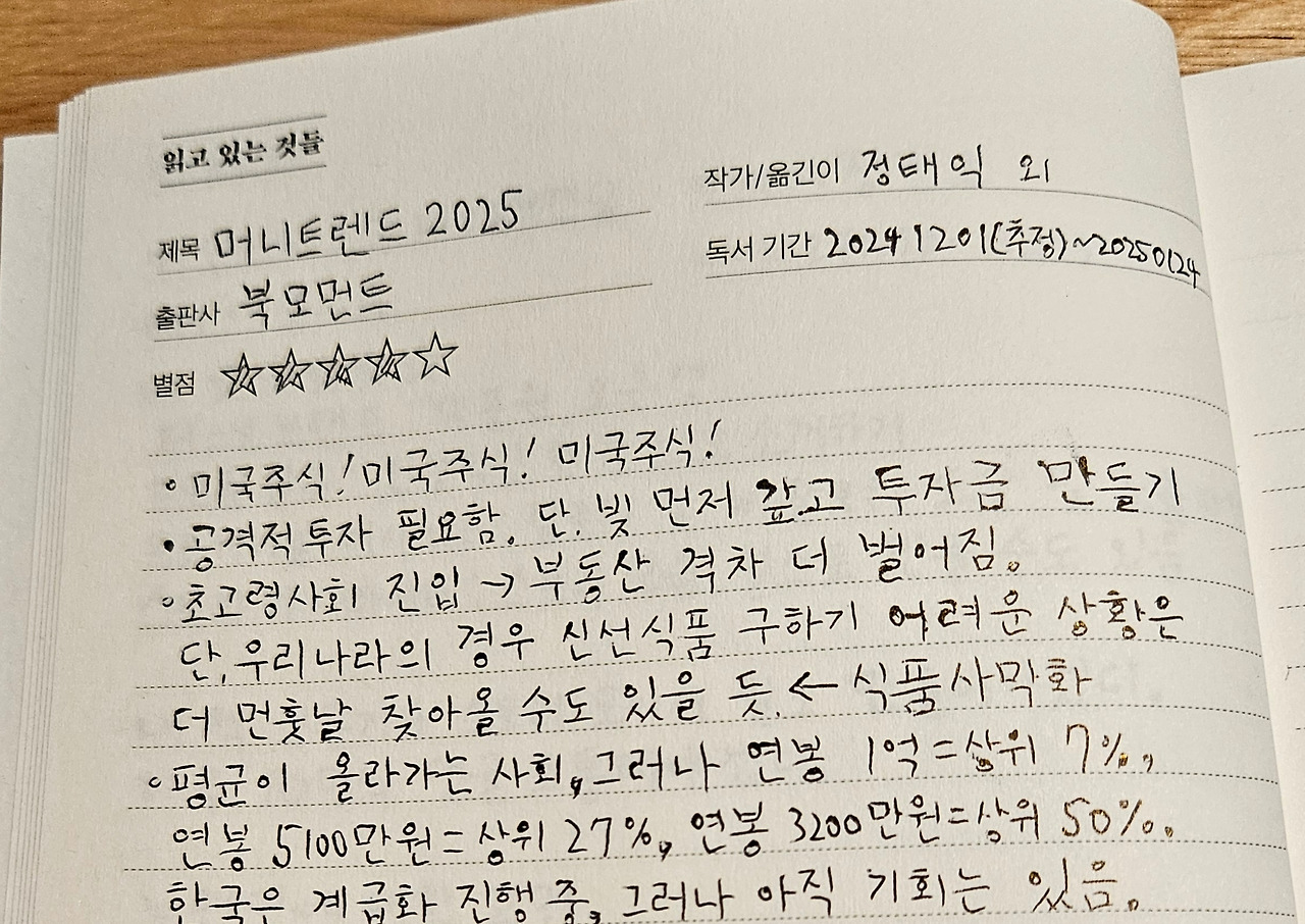 《머니트렌드 2025》는 경제 공부가 필요하다고 생각해서 고른 책이다. 평범한 국어 선생답게 경제 쪽이랑 친하지 않아서 쉽사리 손이 가지 않아서 읽는 데 시간이 많이 걸렸다.