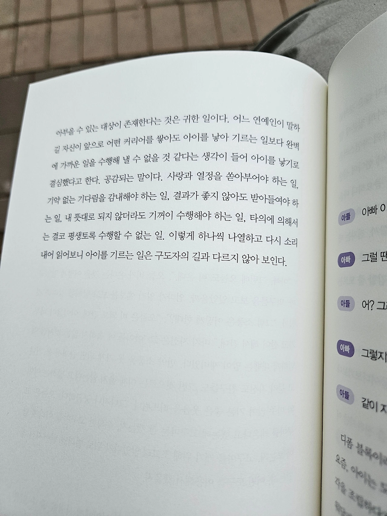 책장을 넘기다 보면 이런 생각이 든다. '아, 이건 그냥 귀엽거나 훈훈한 이야기의 모음이 아니구나.' 이 책은 부모로 살아가는 일의 기쁨과 고단함을 전부 끌어안고서도 ‘사랑할 수밖에 없는 이유’를 스스로 되묻고 답해가는 여정이다. 그리고 그 여정은 읽는 이의 마음도 서서히 데운다.