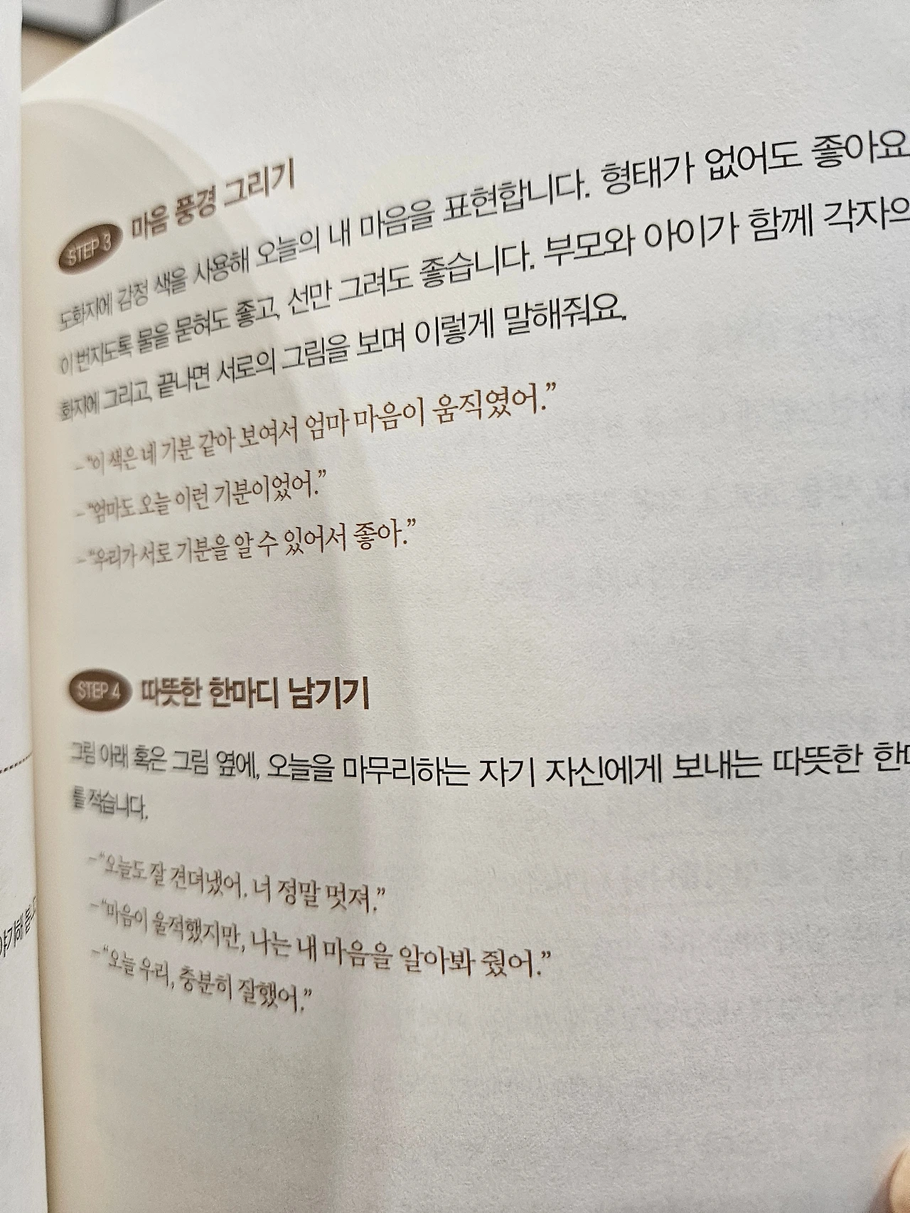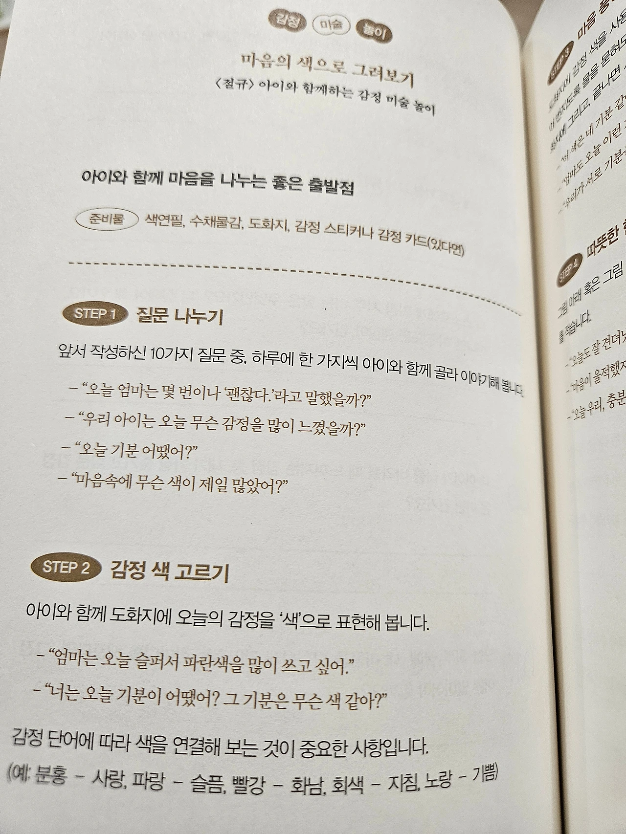 본문이 끝난 뒤에는 두 개의 특별한 섹션이 이어진다. 하나는 부모가 자신의 생각을 정리할 수 있는 질문 노트, 또 하나는 아이와 함께 할 수 있는 감정 미술 놀이다.