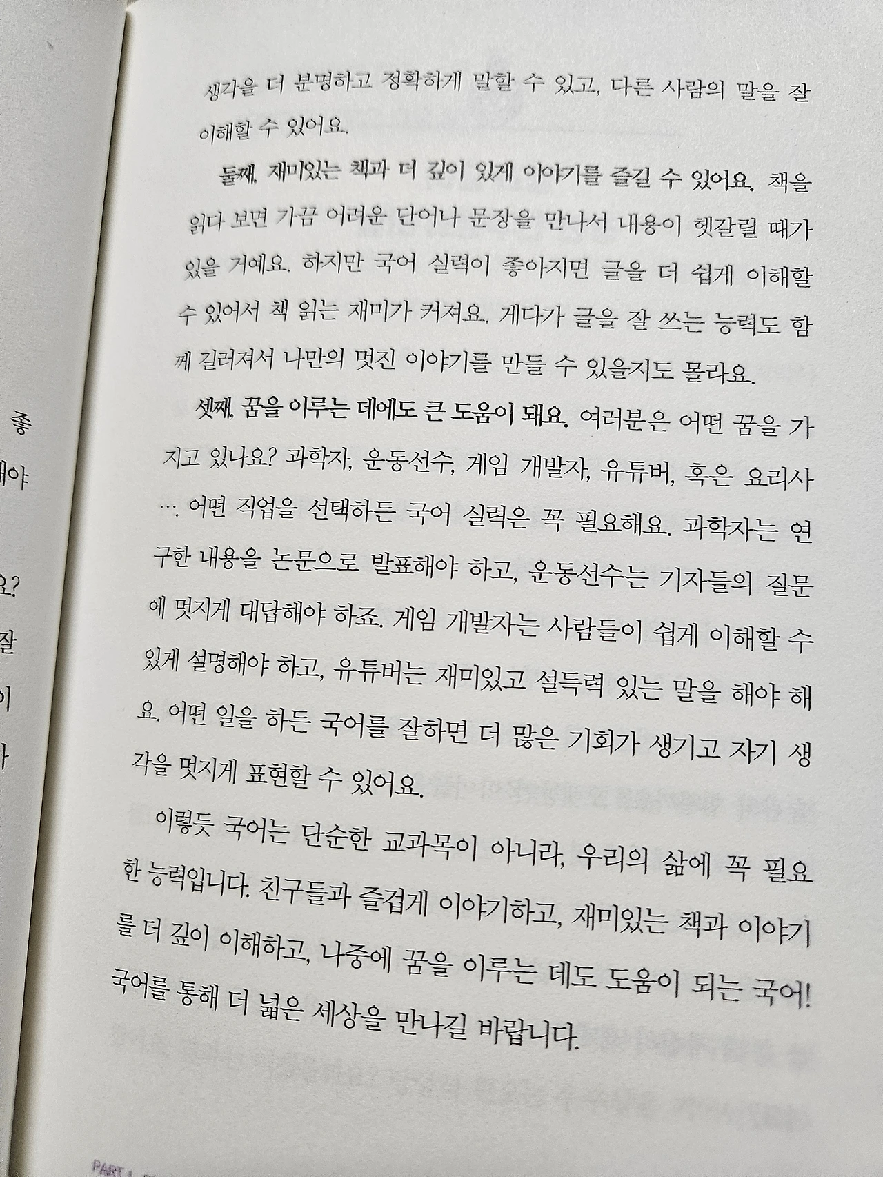 Part 1은 국어, 수학, 사회·역사, 과학의 네 과목으로 이루어져 있다. 내가 국어 교사이다 보니 아무래도 국어 파트가 가장 인상 깊었다. 그중에서도 ‘온종일 아니 꿈에서도 함께 하는 국어’라는 문장이 마음에 와닿았다. 이처럼 도구 교과로서 국어의 특징을 잘 나타내는 문장도 없다는 생각이 들었기 때문이다. 책 속에서는 “국어는 단순한 교과목이 아니라 우리의 삶에 꼭 필요한 능력”이라고 강조한다. 친구와 더 잘 소통하고, 책을 더 깊이 이해하며, 나만의 이야기를 멋지게 표현하는 힘이 모두 국어에서 비롯된다고 말한다. 국어 실력이 좋으면 꿈을 이루는 데도 도움이 된다는 구체적인 사례들이 이어져서, 아이들에게도 설득력 있게 다가온다. 국어 교사인 나에게는 소통과 독서, 언어 도구로서의 국어의 가치와 여러 다양한 수업 접근법을 다시금 생각하게 해 주는 대목이었다.