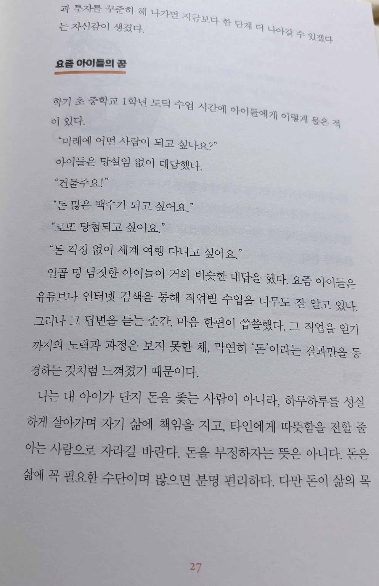 작가의 육아 가치관은 밝고 또렷하다. '돈을 좇는 사람이 아니라, 하루하루를 성실하게 살아가며 자기 삶에 책임을 지고, 타인에게 따뜻함을 전할 줄 아는 사람'. 아이가 이런 어른으로 자라길 바란다는 작가의 말에 깊이 공감한다. 나 역시도 우리 아이들이 이렇게 자라길 바란다. 이것이 가장 중요한 기준이 된다면 다른 것들은 상대적으로 덜 중요한 것들이 된다. 덜 중요한 것들은 덜어낼 수 있는 대상이 되는 것이다. 마음이 한결 가벼워짐을 느낀다.