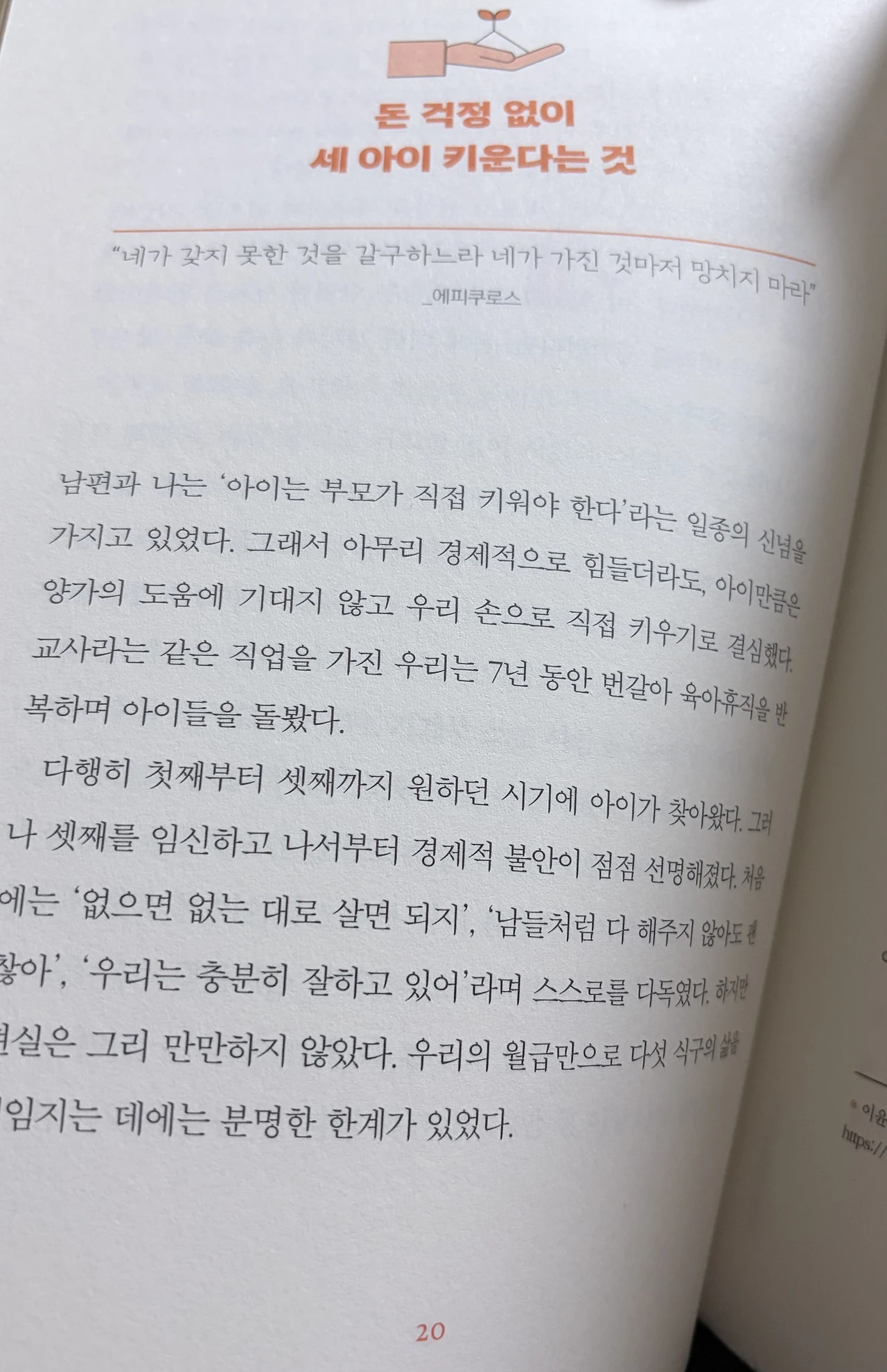 첫 장부터 시선을 확 사로잡는다. '아이는 부모가 직접 키워야 한다'는 신념. 그 신념을 실천하고 있는 작가 - 신념의 대상이 무려 셋이다. 나도 같은 신념으로 아내와 함께 아이 둘을 키우고 있다. 하지만 이게 얼마나 힘들고 끝이 안 보이는 일인 줄 너무나도 잘 알고 있다. 그렇기에 작가와 이 책에 더 강한 신뢰감이 생겼다. 나는 하나 덜 키우면서도 이렇게 허덕이는데. 저자는 분명 더 큰 어려움을 안고서도 치열한 고민과 연구 끝에 그에 대한 답을 찾았을 것이고, 이렇게 책으로 내놓았을 것이다.