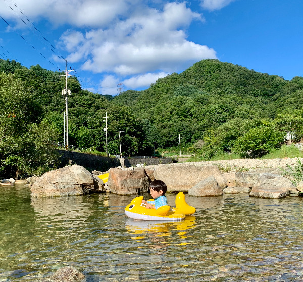 남편과 나, 38개월 아이 그리고 강아지까지 3인 1견인 우리 가족은 이번 여름휴가를 캠핑으로 정했다. 정확히 말하자면 차와 텐트를 연결하여 지내는 반(半)차박이었다. 여행을 너무 늦게 계획해서 지낼 곳이 있을지 걱정했지만, 우연히 알게 된 오토캠핑장은 웬일인지 자리가 넉넉하게 남아있었다. 자리 대여비도 1박에 4만 원이었다. 성수기인데도 그 가격이라니! 힘들게 친 텐트가 아깝다는 핑계로 2박을 예약했다. 그리고 당일, 우리는 새로 산 냉장고와 음식, 물놀이 용품과 옷가지를 차 트렁크 한가득 싣고 강원도 횡성의 캠핑장으로 떠났다.