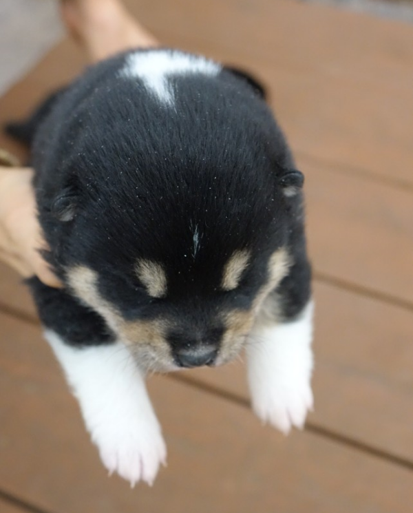 사진으로만 봐온 비빅이의 귀여운 모습과 내가 과연 잘 키울 수 있을까 하는 마음이 섞여 설렘 반, 걱정 반으로 차에 올랐다. 비빅이는 다른 흑시바에 비해 흰색 털이 상당히 많았다. 목덜미에는 연유를 뿌린듯한 무늬가 있었고, 가슴엔 불사조(흑시바의 가슴 털은 불사조 모양이 대회 기준으로 이쁜 것이라고 한다) 대신 솜사탕 같은 하얀 털이 뭉쳐있었다. 양쪽 앞발은 흰색 양말이 끼워져 있는 것 같았다. 꼬리의 흰 털은 또 어찌나 깜찍하던지. 남편과 나의 눈에는 그런 점이 비빅이만의 특별한 매력 포인트로 보였다.