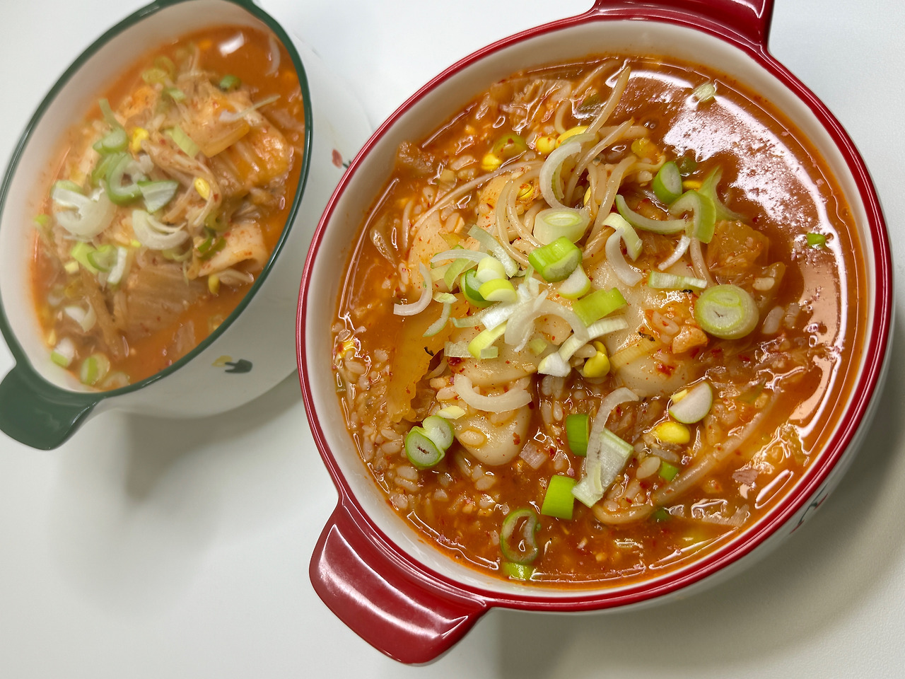 얼마 뒤 엄마가 집에 오셨다. 콩나물과 떡국떡을 사 들고서. 갱시기를 끓이는 건 라면만큼이나 간단하다는 말로 조리를 시작한다. 김치와 콩나물 한 봉지, 떡국떡 한 줌, 그리고 고슬고슬한 밥 한 덩어리면 충분했다. 김치를 숭덩숭덩 썰어 물과 끓인다. 우리 집 부엌에 김치의 새콤하고 칼칼한 향이 흩날리기 시작한다. 거품을 걷어내며 끓이다 밥과 떡을 넣고 한 번 더 보글보글. 콩나물을 넣고 집에 있는 대파와 마늘까지 더해서 조금 더 끓이면 완성이다. 엄마는 뭘 이런 걸 사진으로 찍냐며 핀잔이더니 대파를 위에 흩뿌린다. 귀여운 갱시기 요리사. 그날의 갱시기는 꼭 남겨두고, 글로 쓰고 싶어 사진을 찍어댔다.