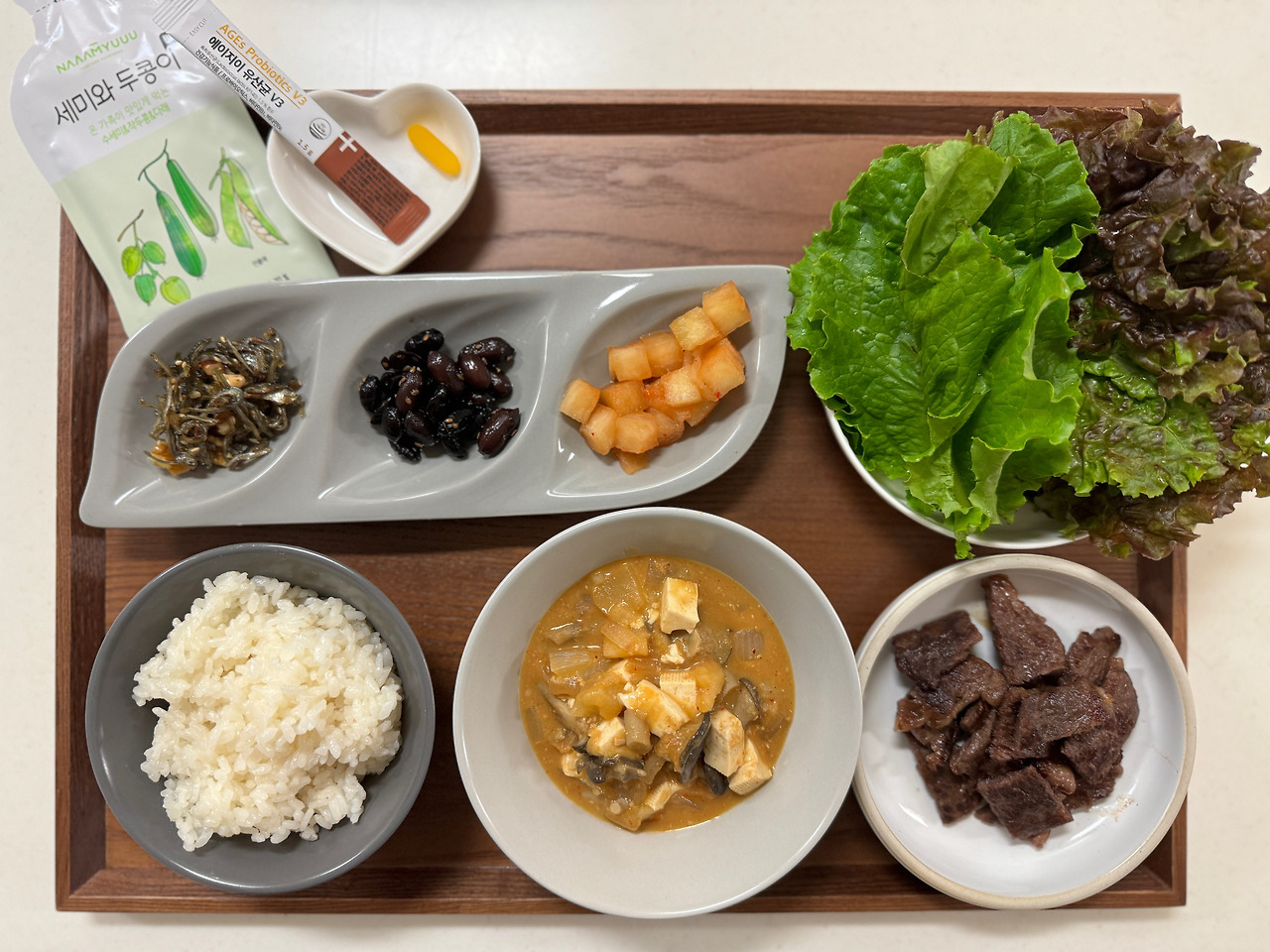 "이런 된장! 역시 믿을 건 너뿐이다. 어쭈, 두부에 쌈채소가 있네. 오늘 너희가 열 일을 좀 해줘야겠어. 밑반찬도 출동 준비하고."