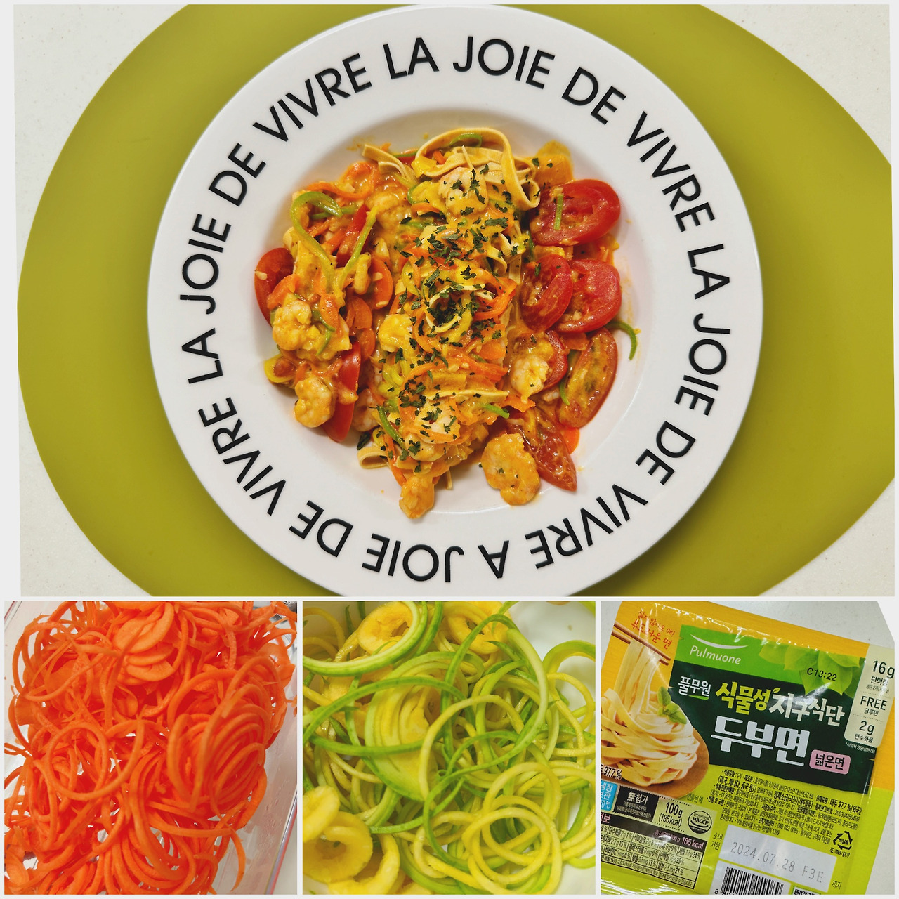식물성 단백질, 두부는 말해 뭐 하겠나. 일단 사서 한 번 조리해 본다. 집에 있는 당근과 애호박을 채칼로 기다랗게 면처럼 뽑아, 토마토와 각종 재료를 넣고 파스타 비슷하게 흉내를 내 봤다. 물론, 전에 먹던 덜 건강하고 더 맛있는 음식은 아니겠지만 아이는 신이 나서 후룩후룹 한 그릇을 비웠다.