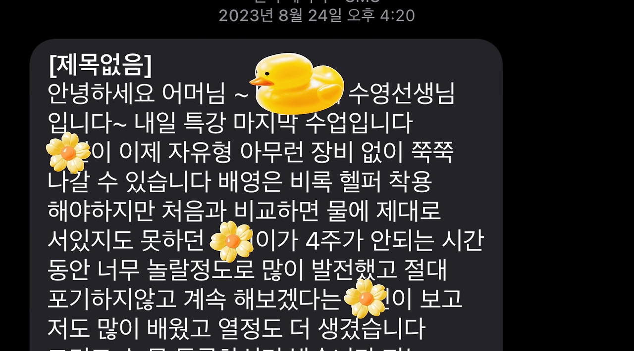 그런 네가 10살의 여름날, 수영수업을 듣겠다고 했을 때 엄만 귀를 의심했어. 생존수영 때의 뻘쭘함이 동기부여로 한몫했겠지만 뭐 어때. 뭐가 됐든 땡큐다.