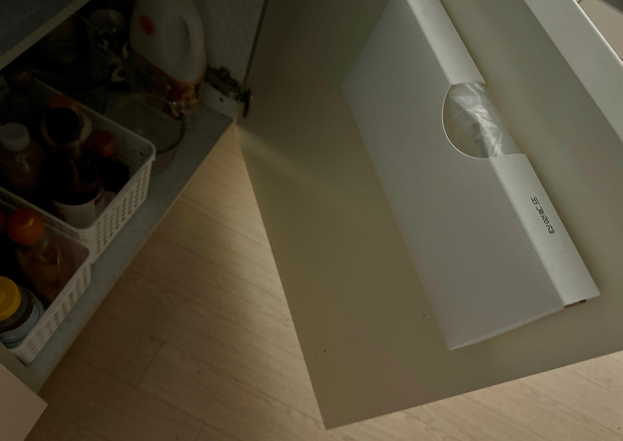 보기 좋게 정리하는 게 아니라, 쓰기 좋게 정리해야 한다. 물컵은 정수기 바로 위 선반에, 밥그릇과 식판은 밥솥과 인덕션 근처. 가벼운 접시는 상부장에, 무겁고 큰 것은 하부장에 보관한다. 요리에 사용되는 양념은 인덕션 바로 밑에 넣되 바구니에 담아 서랍처럼 사용하기. 무침 요리에 자주 쓰이는 비닐장갑은 하부장 문에 붙여 놓고 사용한다. 생활하며 생긴 잔머리와 잔꾀가 빛을 발하는 순간이다.