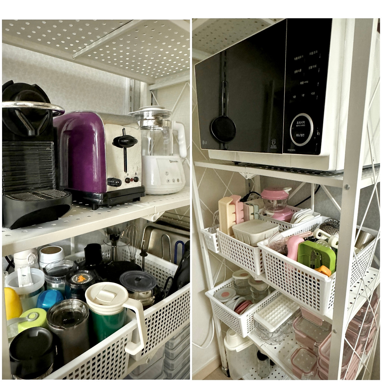 김치냉장고 자리여서 콘센트가 있다는 장점. 이 걸 놓칠 수는 없었다. 자잘한 소형 가전들을 그 안에 넣어두고 필요할 때만 이용한다. 특히 전자레인지와 토스트기는 팬트리에서 꺼내지 않고 바로 사용 가능하니 더없이 편리하다. 문을 닫아두면 아기 손에 닿지 않는다는 것 또한 큰 장점이다.