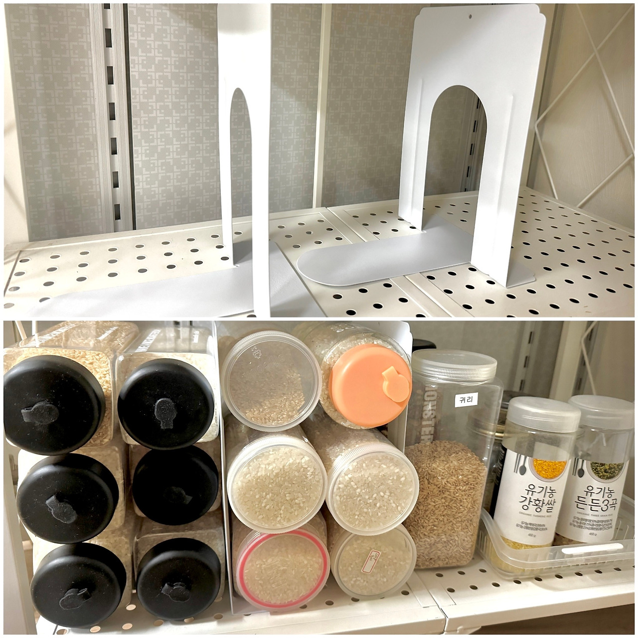 정리의 구역을 나눌 때 유용하다. 아무래도 그냥 쌓는 것보다는 더 단정하게 정렬이 된달까. 곡류를 눕혀서 보관할 때도 북스탠드를 이용하면 보다 안정감 있게 사용 가능하다. 주방, 옷장, 책상 정리에 절대 빠지지 않는 애정의 장비다.