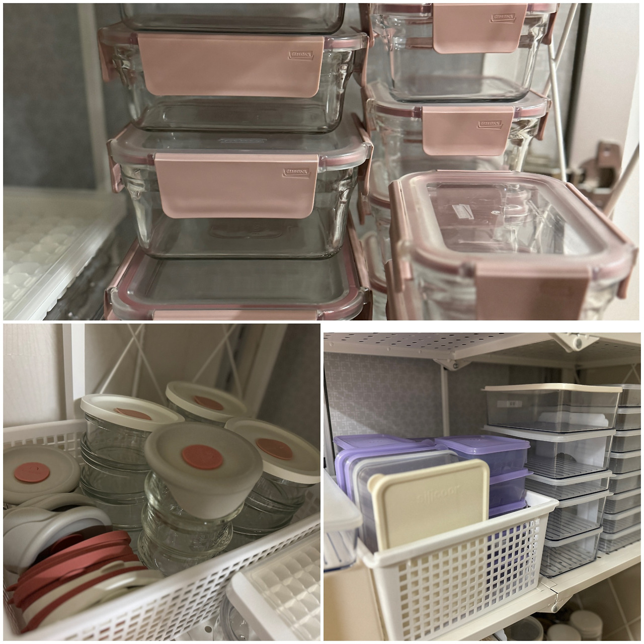 밀폐용기는 적어도 많아도 문제다. 정리 방법도 다양해서 문제다. 우선 우리 집에 필요한 밀폐용기의 종류와 수량을 정해야 한다. 우리 집의 경우는 채소와 고기를 소분하는 일이 많기 때문에 냉장 냉동 소분 용기를 넉넉하게 구입했다. 그리고 유리용기를 선호하기에 소재를 통일하려 애쓰는 편이다. 같은 종류, 비슷한 색상으로 구매하면 뚜껑을 찾아 헤매는 일이 없어 관리가 쉽고 정리도 쉽다. 뚜껑 없이 겹쳐 보관하는 것이 부피적으로 이득인지 고려해서 차이가 크다면 뚜껑을 따로 보관한다. 하지만 큰 차이가 없다면 뚜껑을 각각 덮어 보관하는 게 다음 사용에 편리하다. 꼭 기억할 것은 생각보다 밀폐용기가 그렇게 많이 필요하지는 않다는 점. 특히 오래된 플라스틱 용기는 지금, 바로, 당장 정리할 타이밍이다.