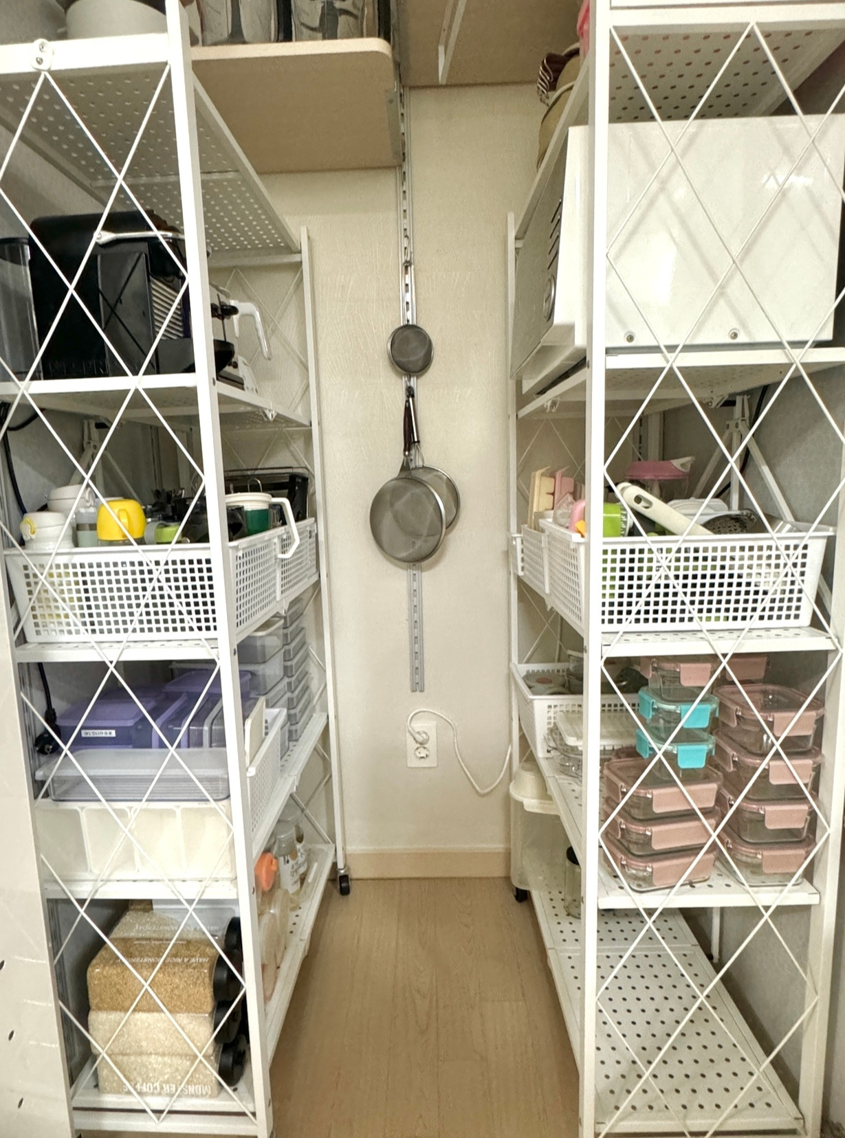 리모델링도 하지 않았다. 그렇게 김치냉장고 자리는 그냥 문 달린 창고가 되어버렸다. 어떻게 활용하면 좋을까 하다 몇 년 전 조립식 수납선반을 두 개 사서 넣고, 그 안을 팬트리로 활용했다. 가끔 두 아이의 숨바꼭질 장소로 활용된다는 건 비밀이다.