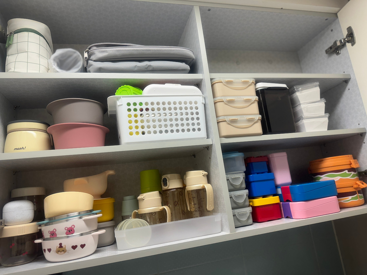 수납장의 칸이 6개라면 한 칸 정도는 스페어로 존재하는 편이 좋다. 닿기 어려운 최상단이나 최하단에 물건을 두면 그 물건은 버릴 때까지 꺼내지 않을 확률이 크다. 손이 자주 가는 아기 물병과 밥그릇은 왼쪽에, 자주 쓰지 않는 도시락은 (조금 더 구석자리인) 오른쪽, 가장 윗자리는 비워두기. 생활해 보니 나쁘지 않은 위치다.