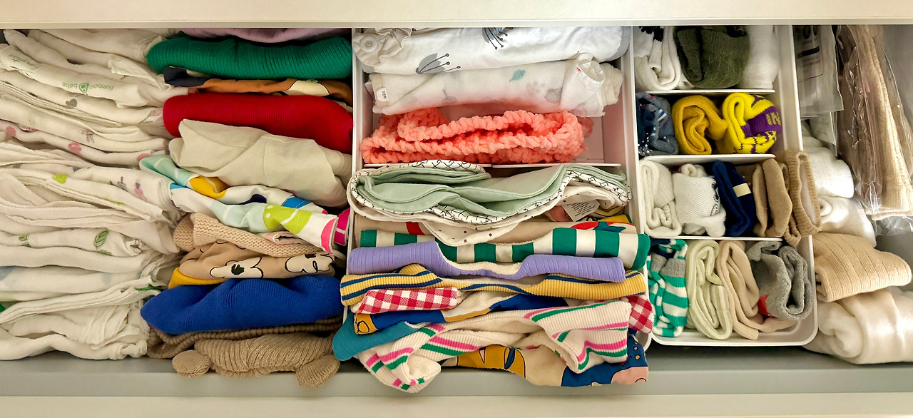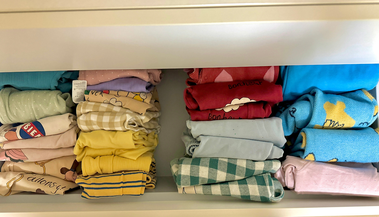 여기까지 읽은 이들은 생각할지 모르겠다. '아기 옷! 손바닥만 한 게 뭐 정리하기 어렵겠어.' 하지만 오산, 오산입니다! 아기옷은 크기가 작고, 접는 법이 어렵지 않아 정리 행위 자체의 난이도가 낮다. 반씩 착착 접어 칸칸이 쏙쏙 넣기만 해도 크게 모양새가 나쁘지 않으니 말이다. 그러나 아기 서랍장은 자주 개미지옥으로 변신하고, 온갖 잡동사니가 모인 공간이 되기 쉽다. 작디작은 아기 몸에 이리 꽂고, 씌우고, 덮고, 입힐 것들이 뭐 그리 많은지. 그러면서 왜 또 항상 부족한 느낌인지. 정리하자. 정신 바짝 차리고.