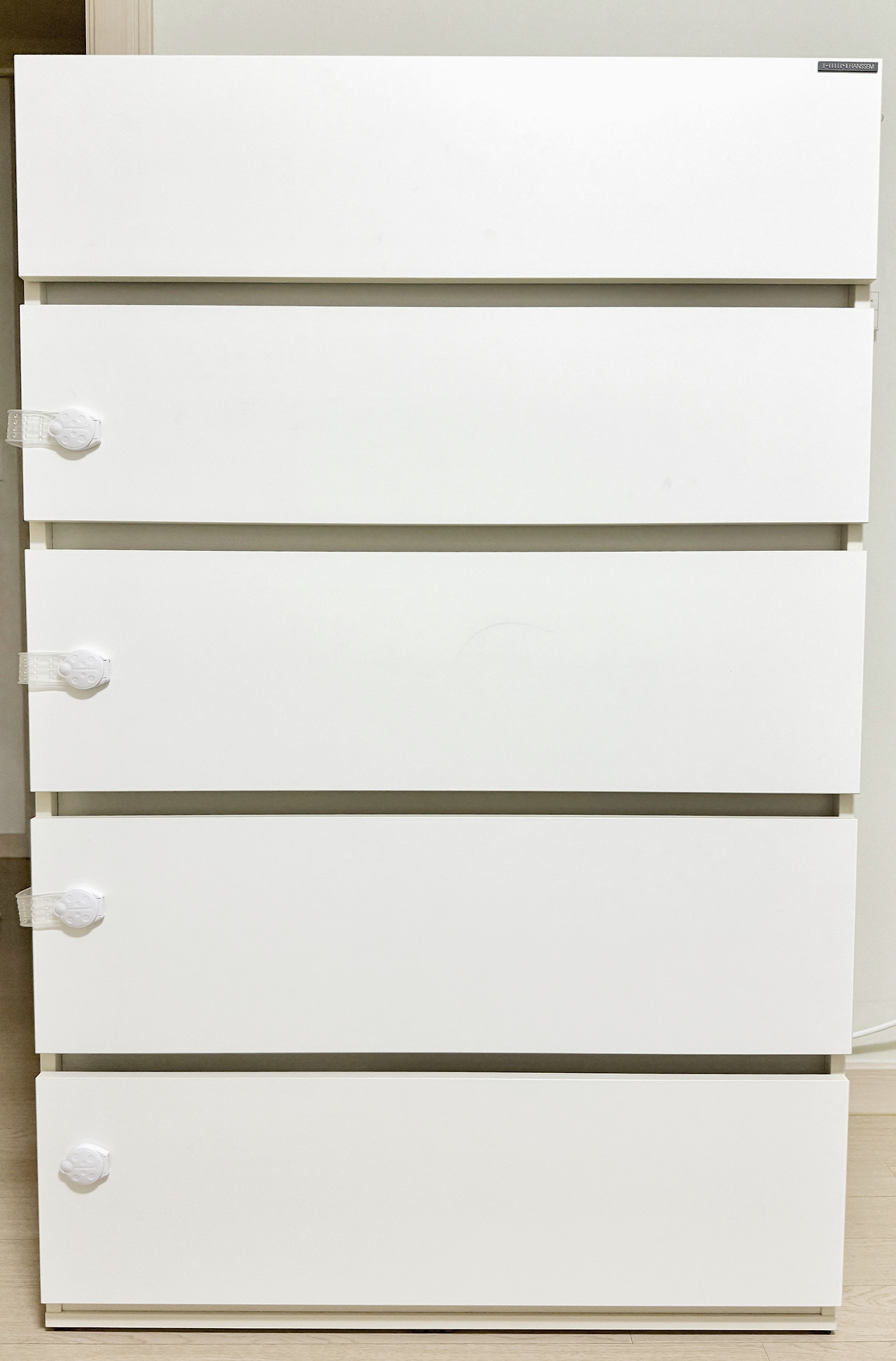 2. 5층에는 가장 자잘한 것들을 넣어둔다. 칸막이가 있는 바구니를 구매해서 서랍장에 두 개만 넣어주었다. 턱받이용, 양말용. 바구니를 사서 가운데에 넣어주면 양 쪽에는 저절로 공간이 분리되어 파티션이 따로 필요 없다. 바구니를 켜켜이 넣지 말고 한 두 개만 넣어두면 끝. 어차피 공간 분리가 목적이니까. tip. 바구니는 꼭 서랍의 깊이와 높이를 고려해서 구매할 것. 아까운 길이가 남을 수도, 서랍이 안 닫힐 수도 있다. 실은 내가 자주 했던 실수를 고백하는 것이다.