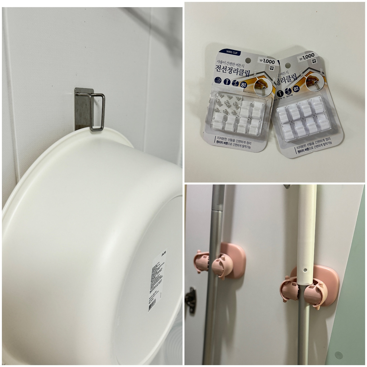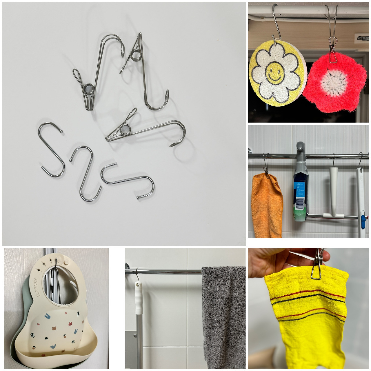 아, 이 아이를 뭐라고 설명해야 할까. 스몰이라 하기에는 너무나 큰 녀석들이다. 정리를 논할 때 이 두 가지를 빼고 말할 수 있을까 싶은 마음이다. 특히 주방과 화장실에서는 편리함의 1등 공신이나 다름없다. 수세미를 걸거나, 집어서 말릴 때 사용하고, 아기의 턱받이, 조리도구 등등 구멍이 있어서 걸 수 있는 물건이라면 어떻게든 걸고, 숨기고, 정리할 수 있게 만들어준다.
