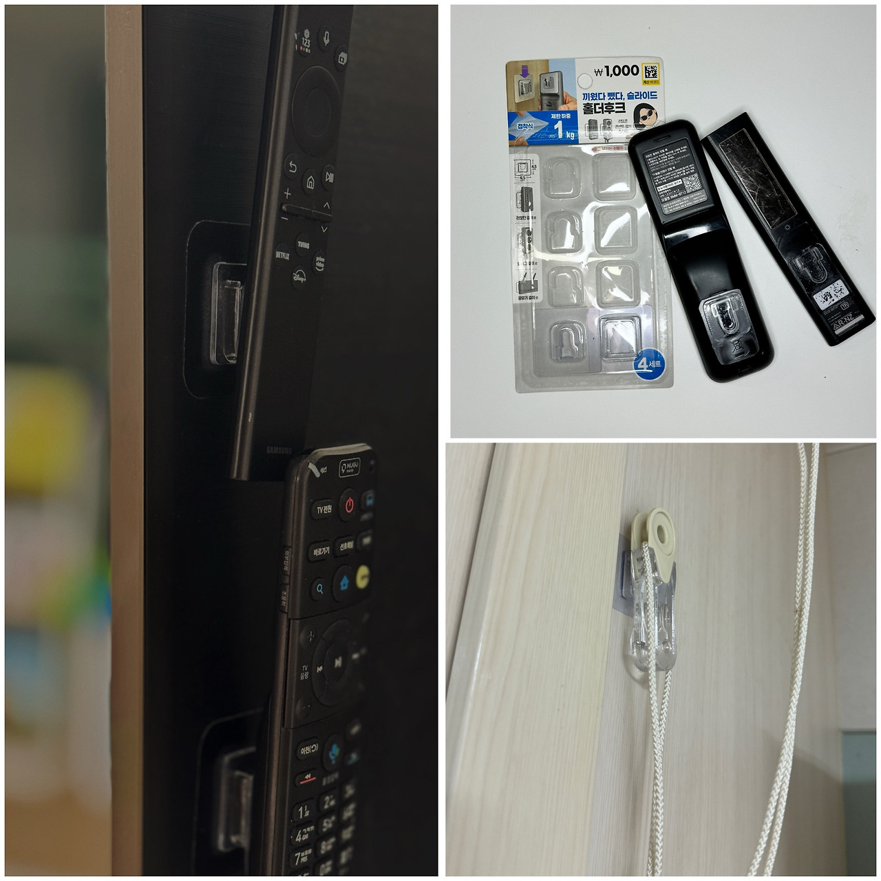 암수 세트로 구성되어 있는 후크를 보관할 곳에 하나, 리모컨에 하나 각각 붙이고 끼워두면 끝. 현재는 티브이 뒷면에 리모컨을 걸어 보관해 둔다. 이렇게 하니 리모컨을 찾아 헤맬 일이 없고, 생활은 아름다워졌다.