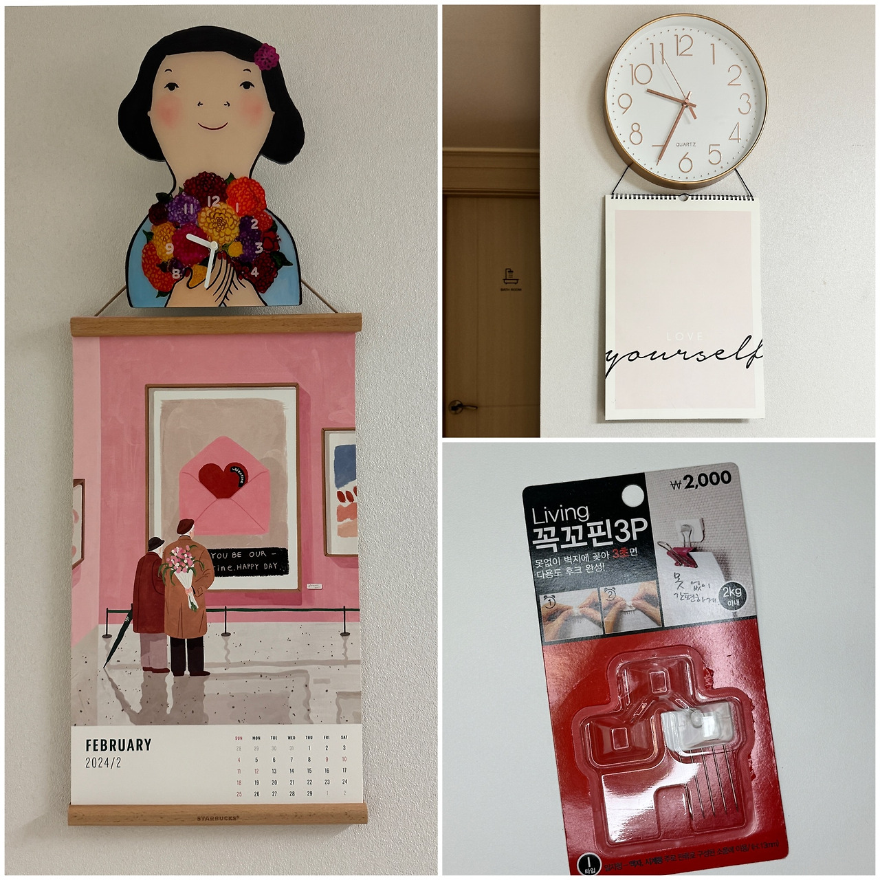 특히 나처럼 여기 걸었다, 저기 걸었다 하고 싶어 하는 변덕쟁이에게는 못질보다 꼭꼬핀이 적합하다. 망치 소리와 못자국으로부터 해방시켜 준다.(단, 가벼운 것들만 가능하다는 점)