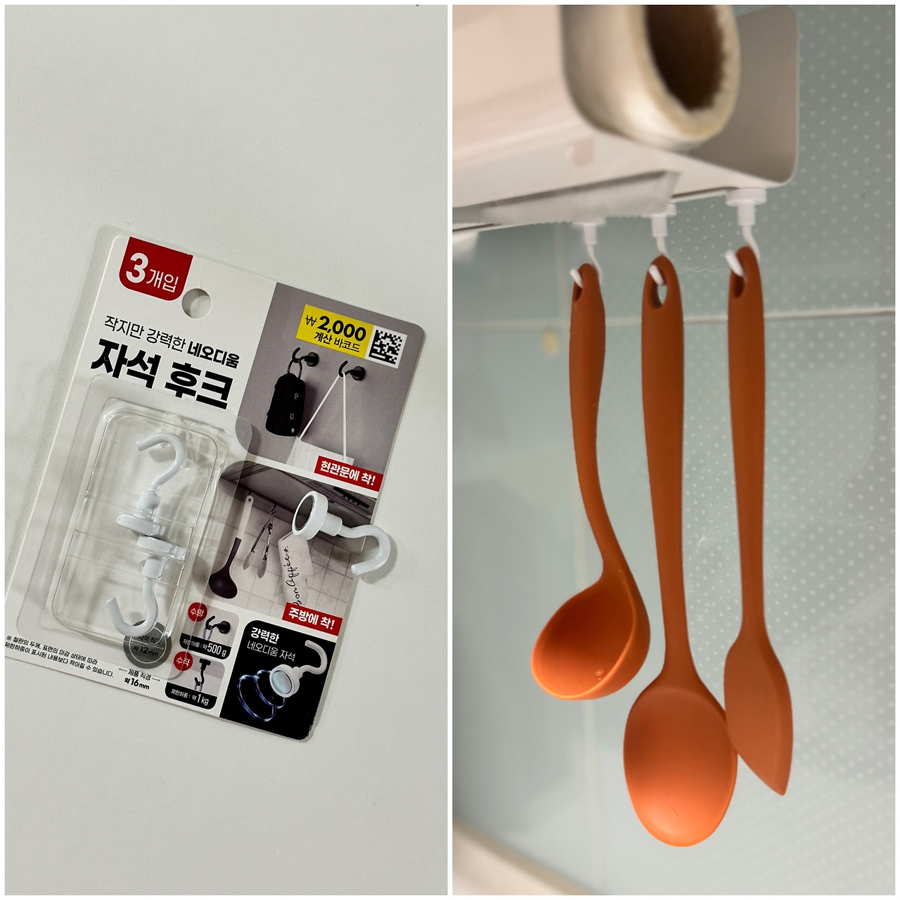 코로나가 한 창일 때는 현관 앞에서 마스크를 찾는 일이 많았기 때문에 늘 자석후크로 새 마스크를 걸어뒀다. 특히 신랑이 출근하다 말고 다시 집에 들어오는 횟수를 줄여준 아이템이었다.