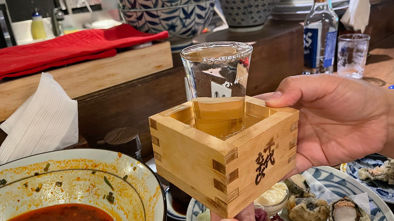 사케는 유리잔의 술을 다 마신 후, 아래 마츠잔에 고인 술을 유리잔에 부으니 한 잔이 더 나온다.